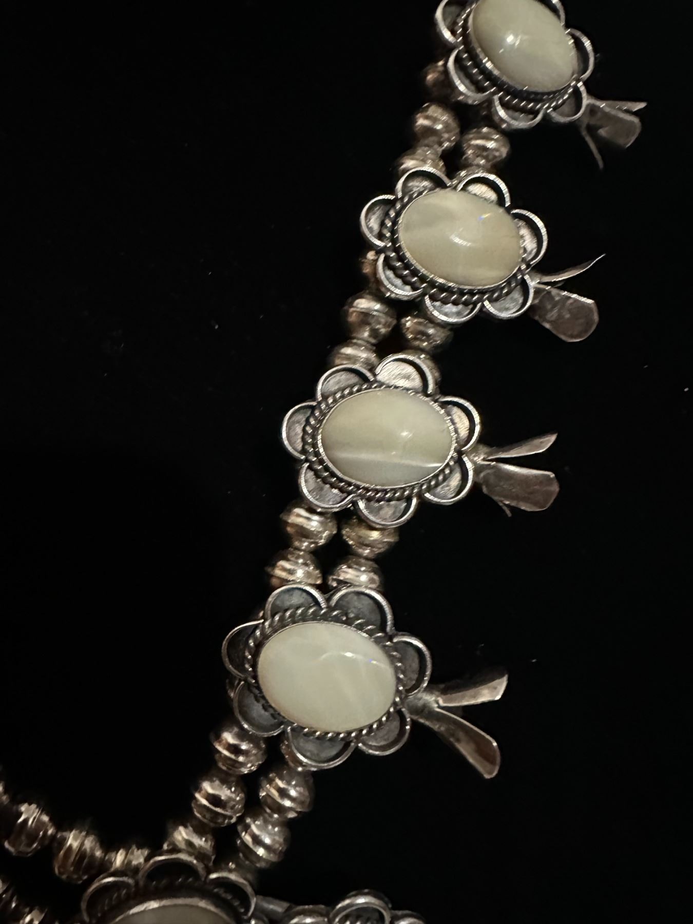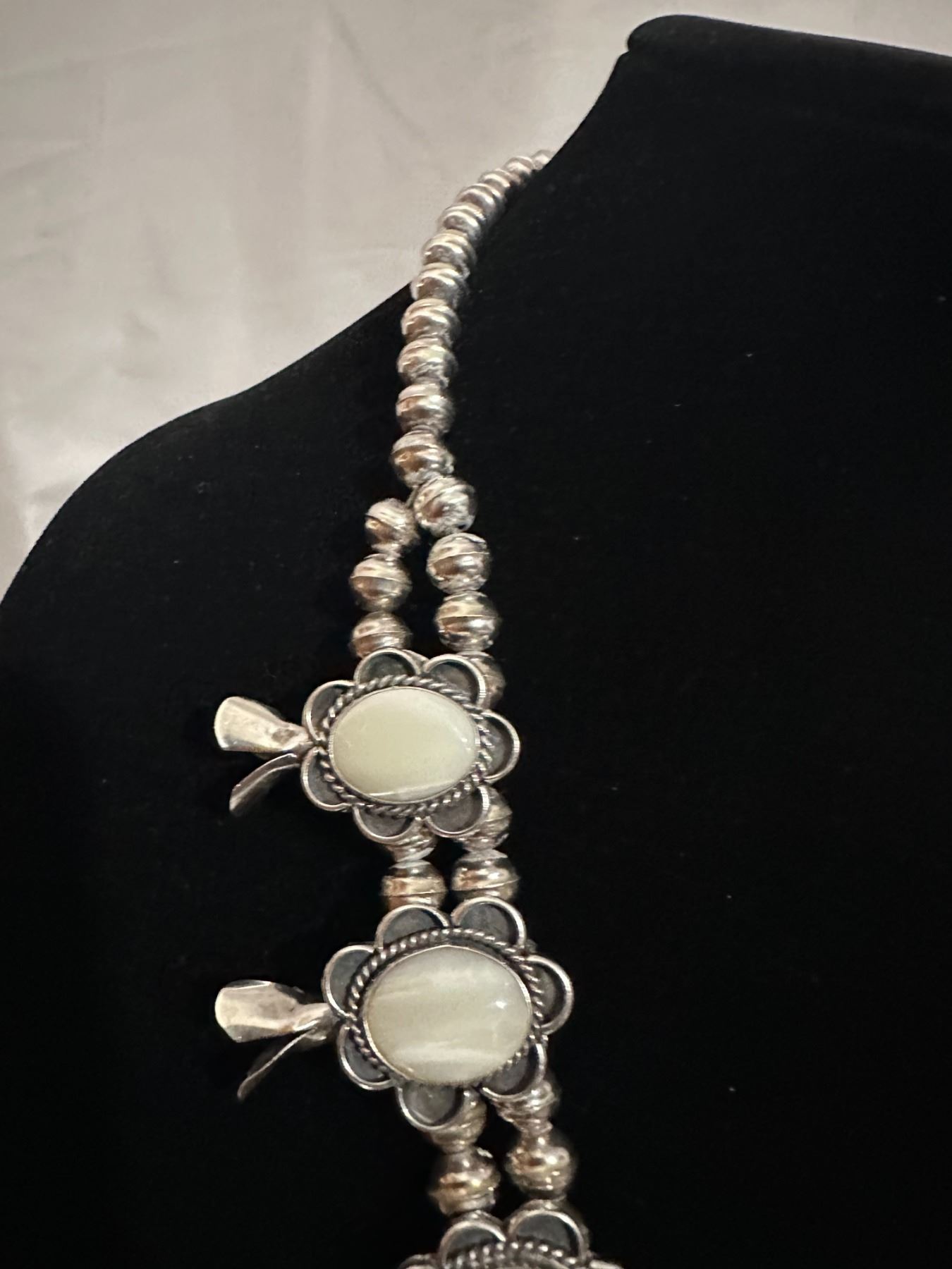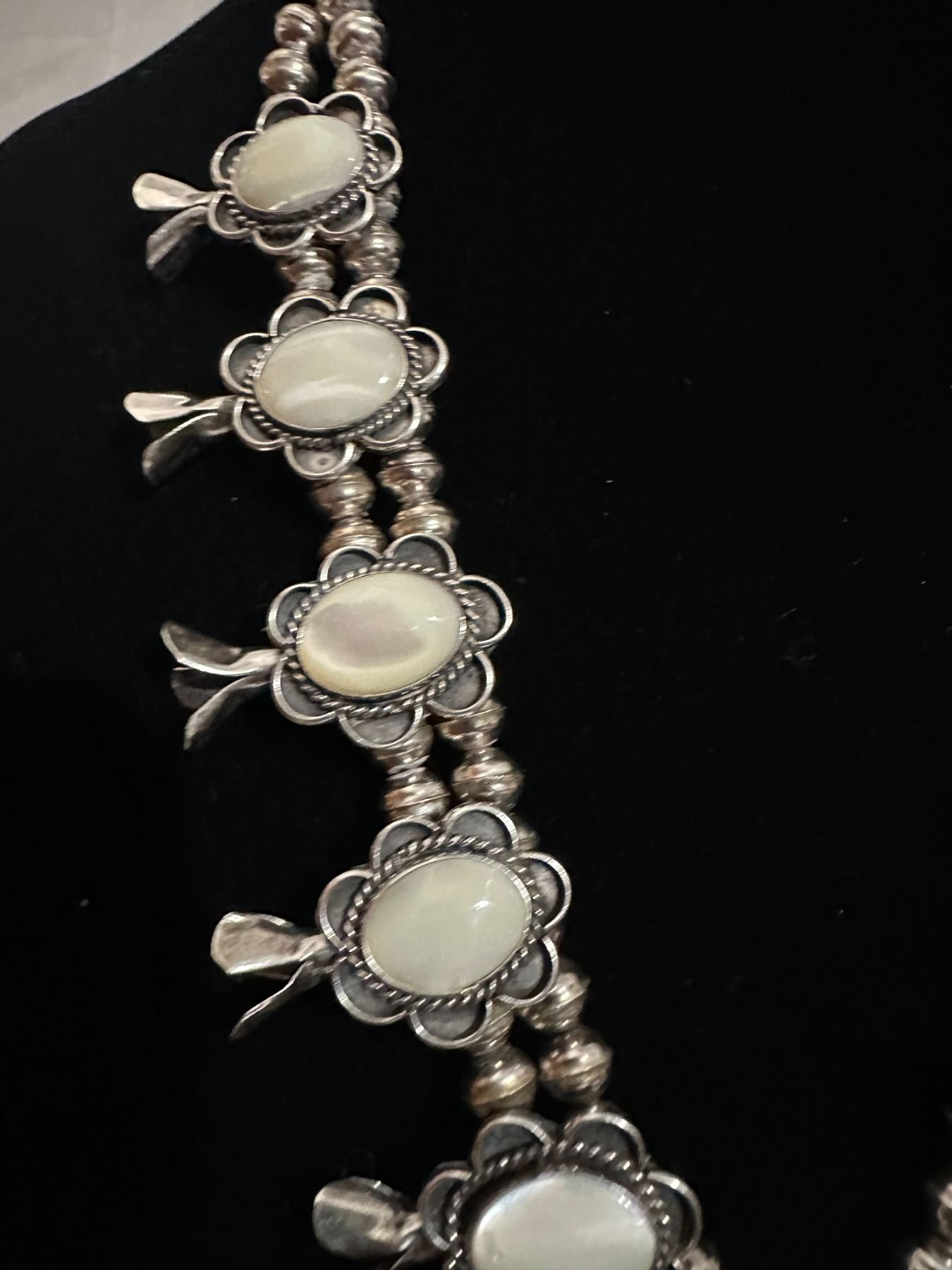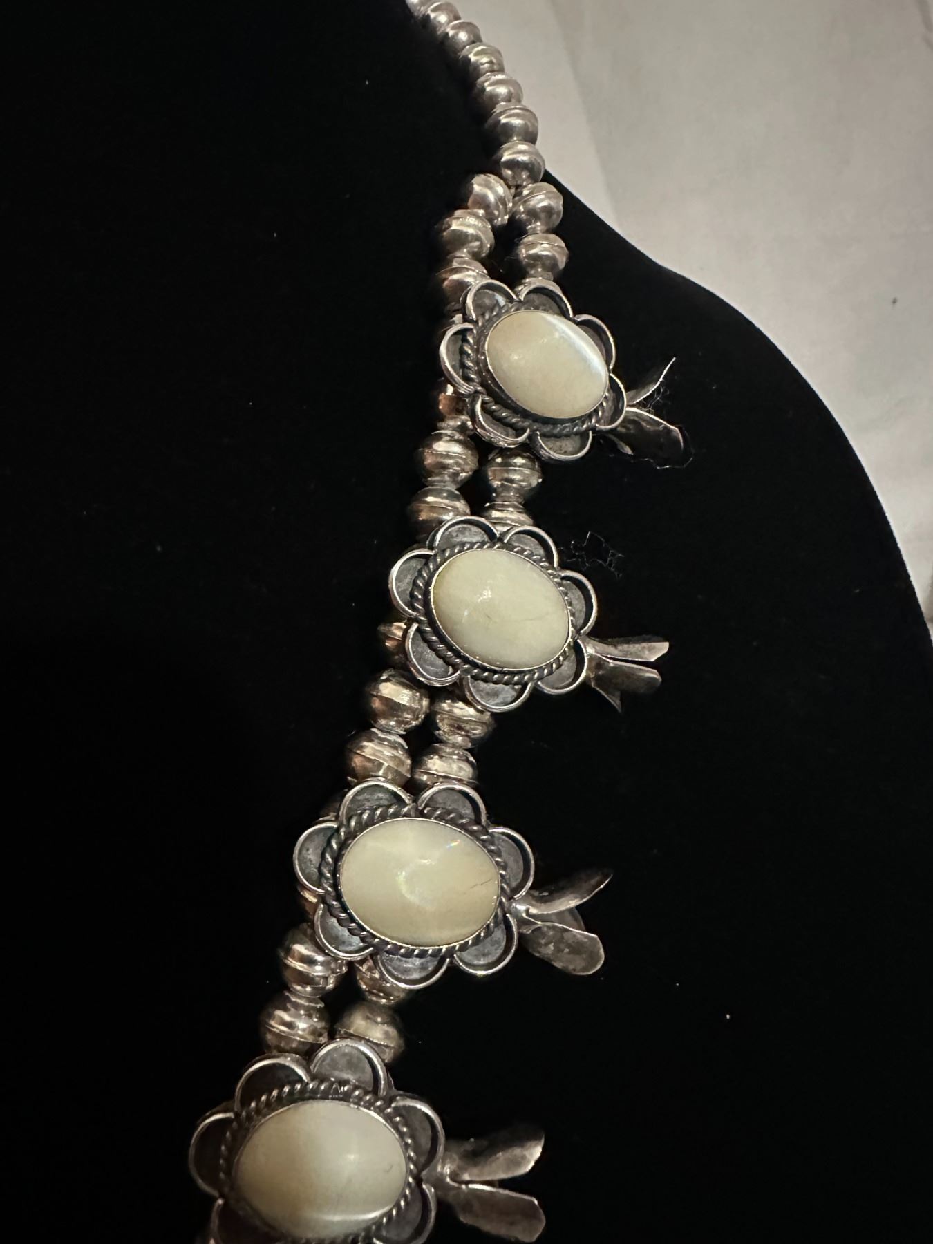 This is an opportunity to own a High end necklace with Opal stones, unlike others necklaces you may encounter. This unique necklace is fashioned with polished stones of Howlite Opal/White Opal, the traditional Navajo Squash Blossom Necklace are adorned with either Turquoise or Corral