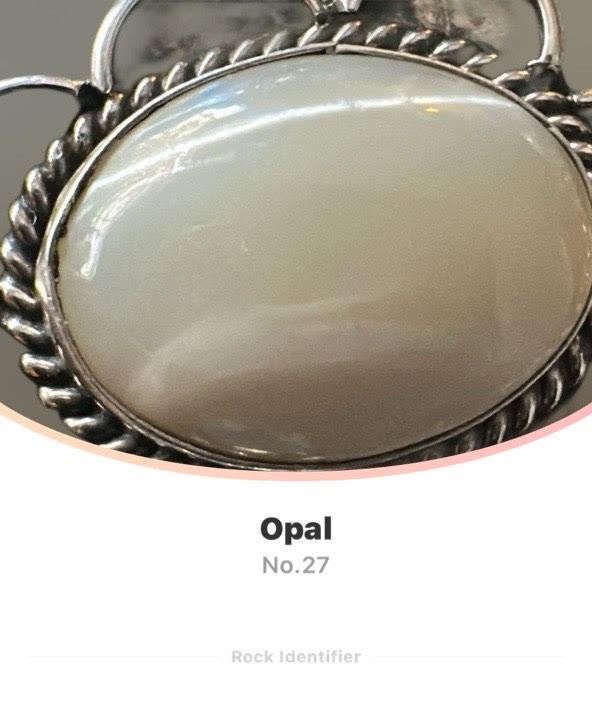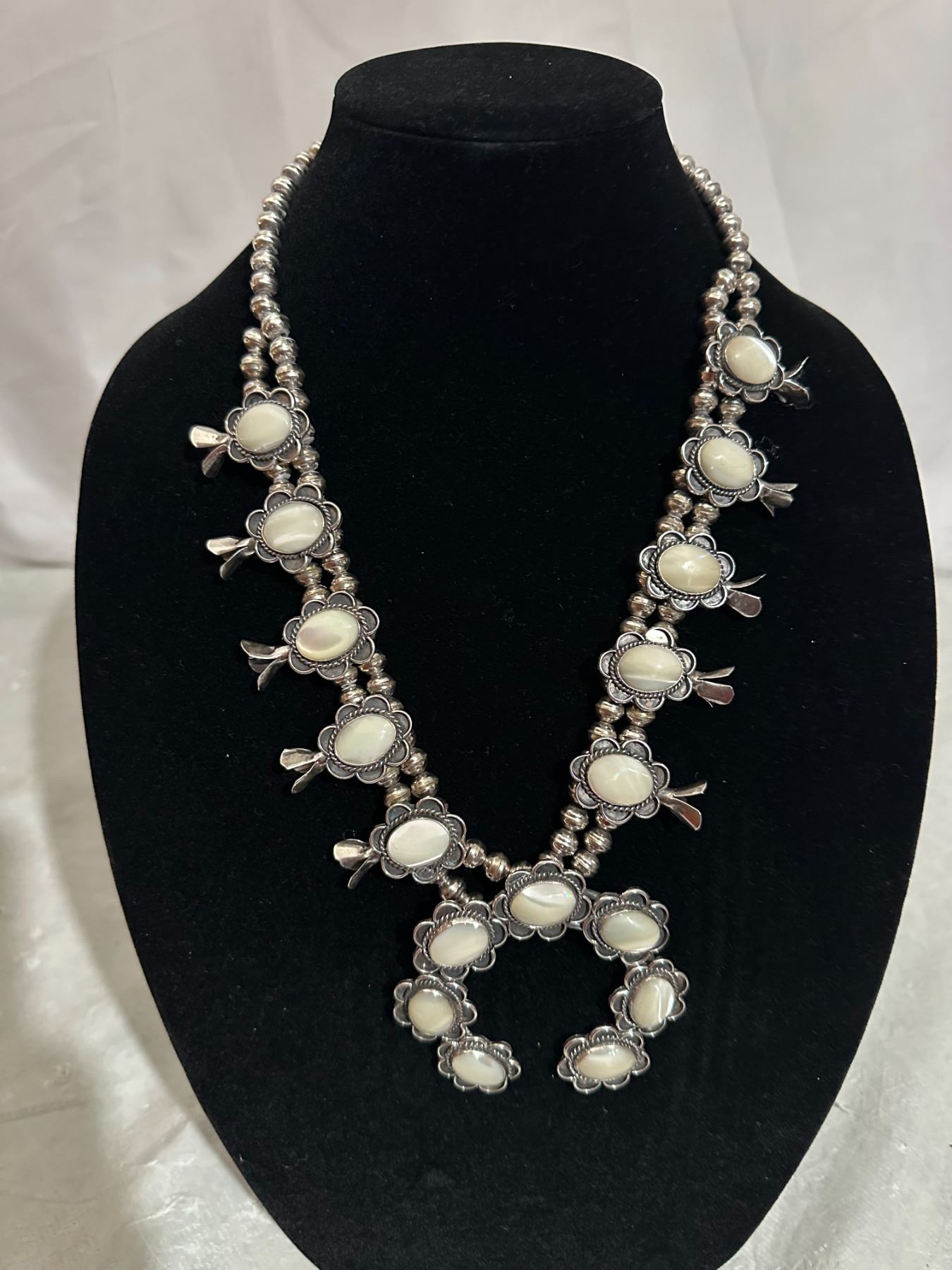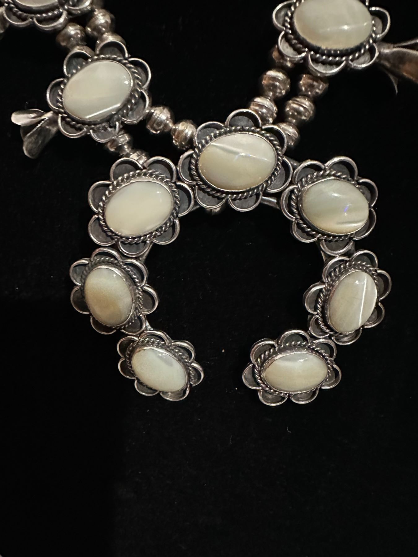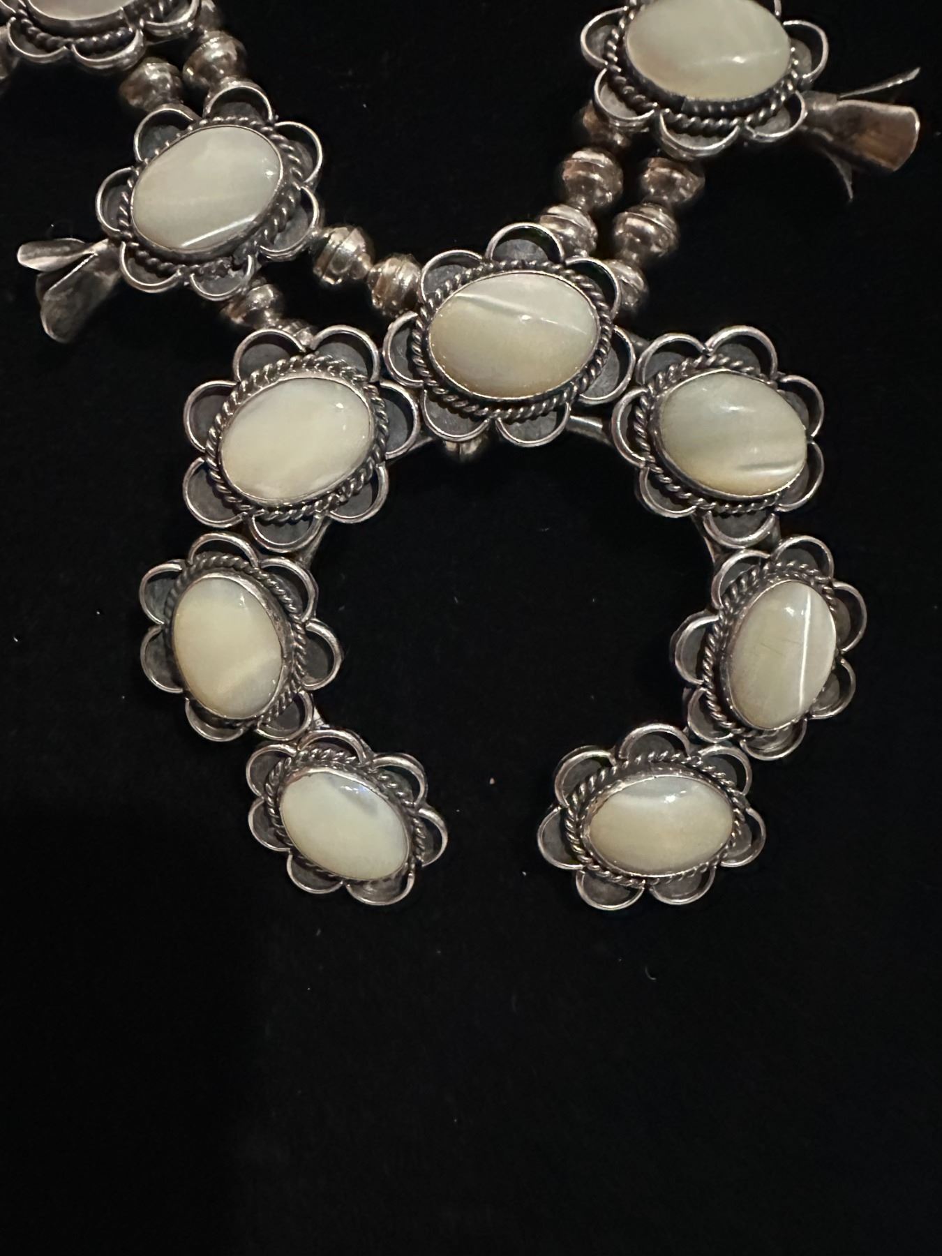 This is an opportunity to own a High end necklace with Opal stones, unlike others necklaces you may encounter. This unique necklace is fashioned with polished stones of Howlite Opal/White Opal, the traditional Navajo Squash Blossom Necklace are adorned with either Turquoise or Corral