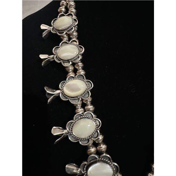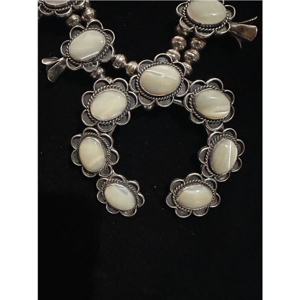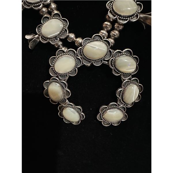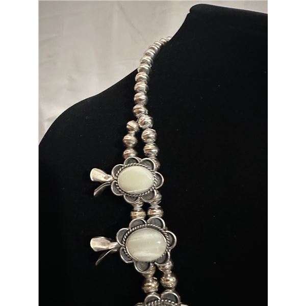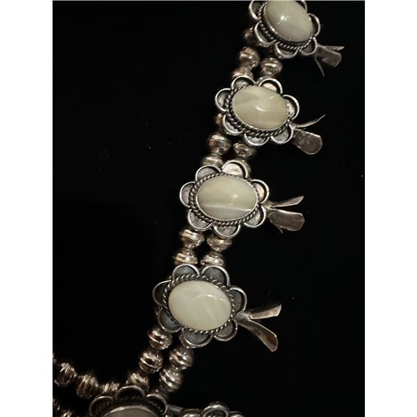 This is an opportunity to own a High end necklace with Opal stones, unlike others necklaces you may encounter. This unique necklace is fashioned with polished stones of Howlite Opal/White Opal, the traditional Navajo Squash Blossom Necklace are adorned with either Turquoise or Corral