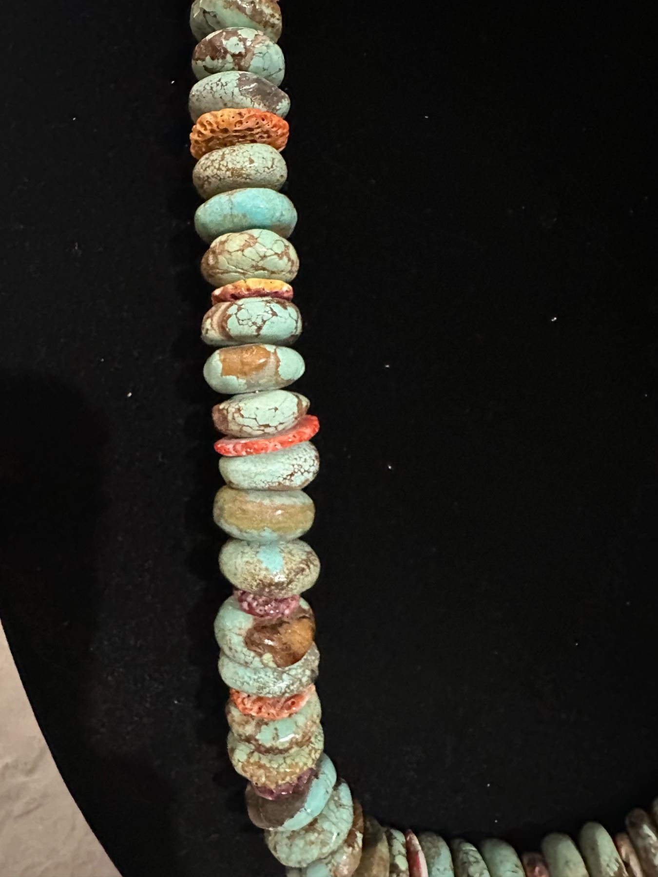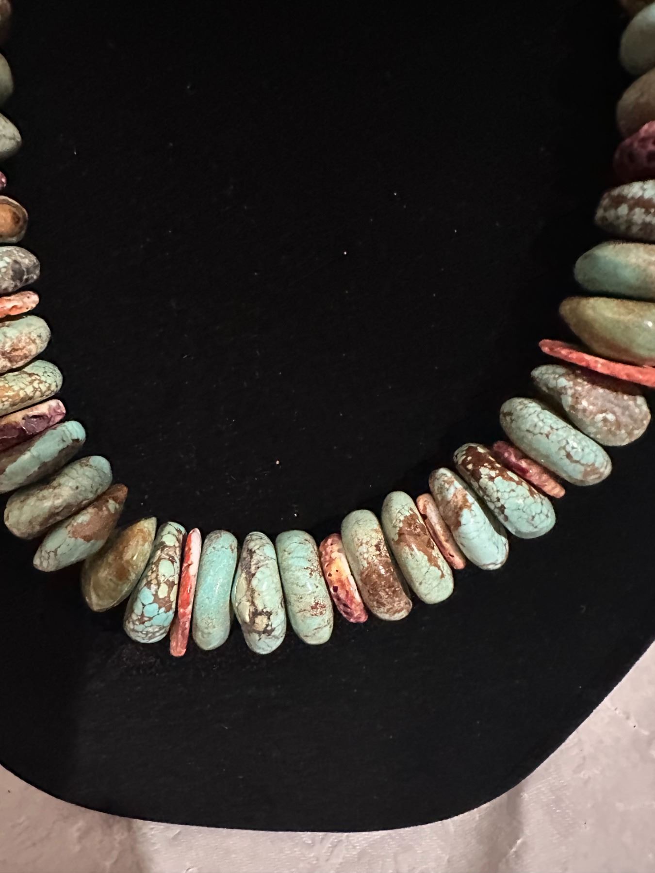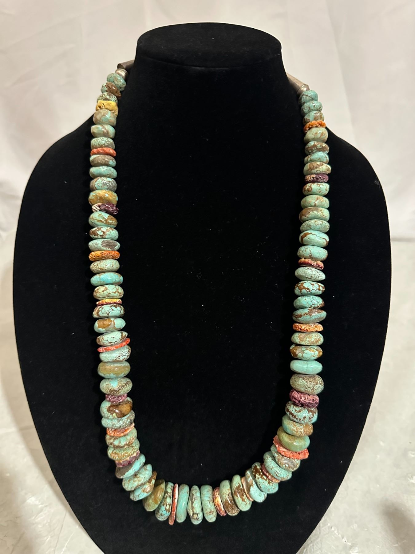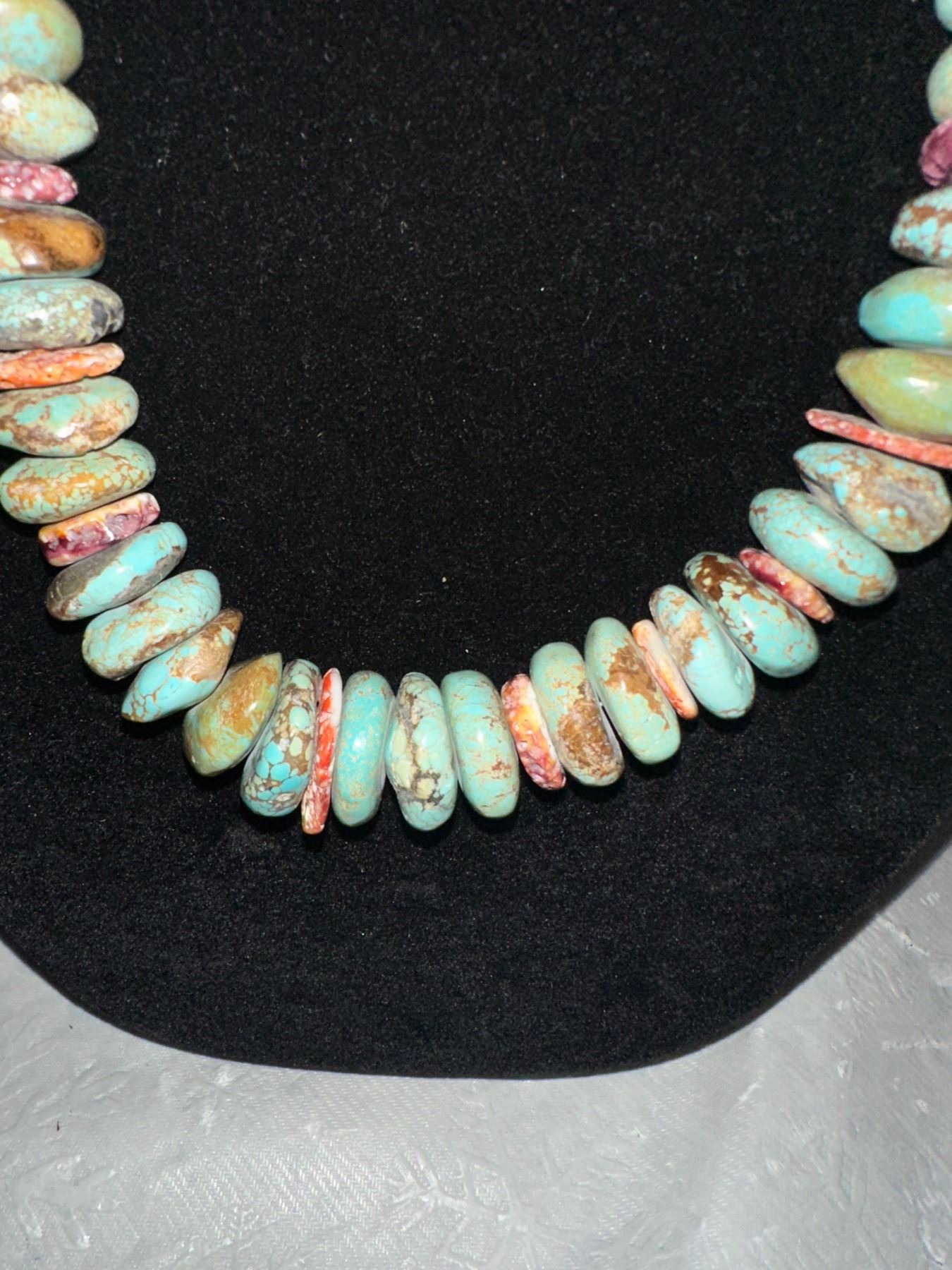Here is an opportunity to own a true fashion piece for a fraction of what a necklace with Royston turquoise. The pieces of spiny oyster offset the stones to break apart the appearance.