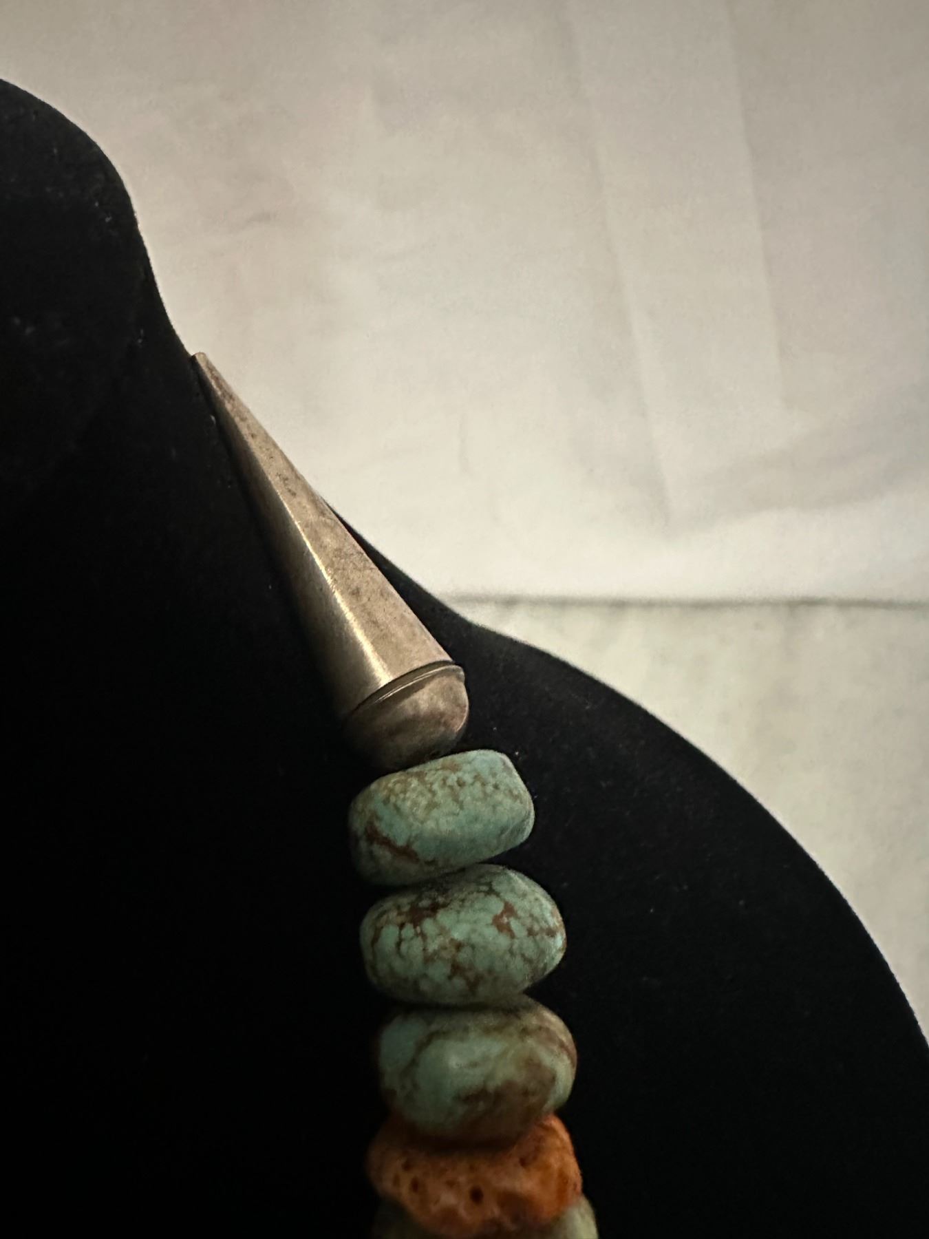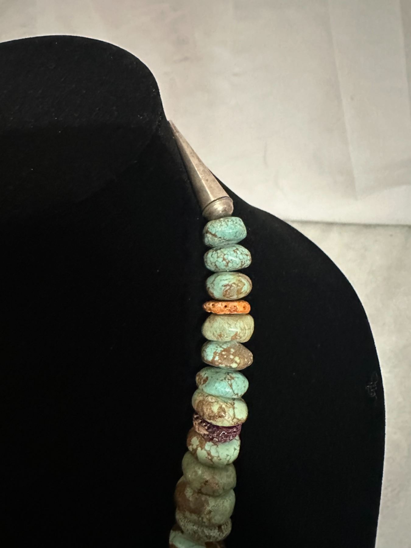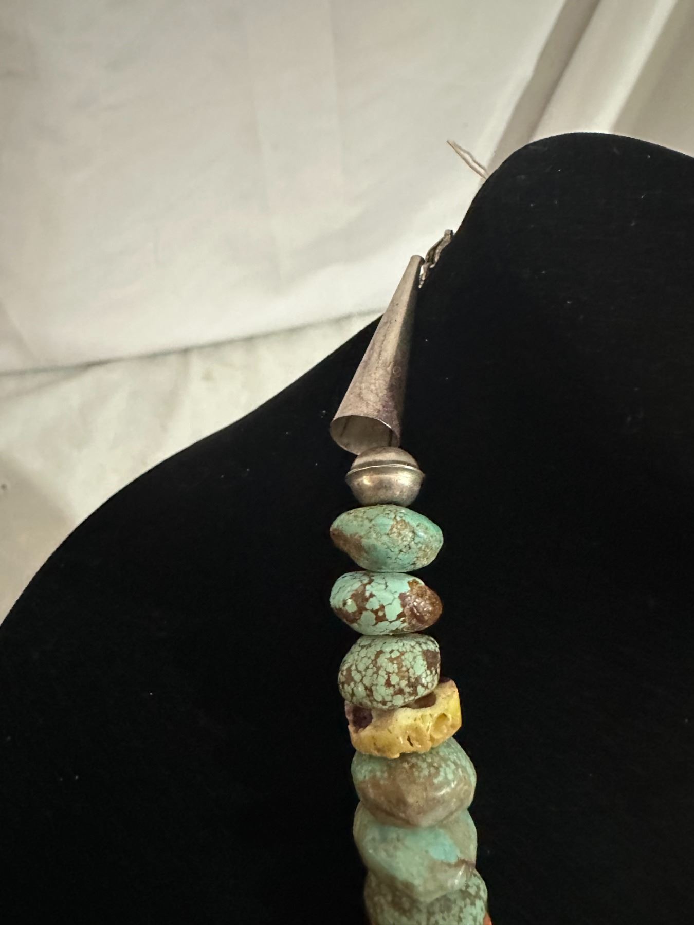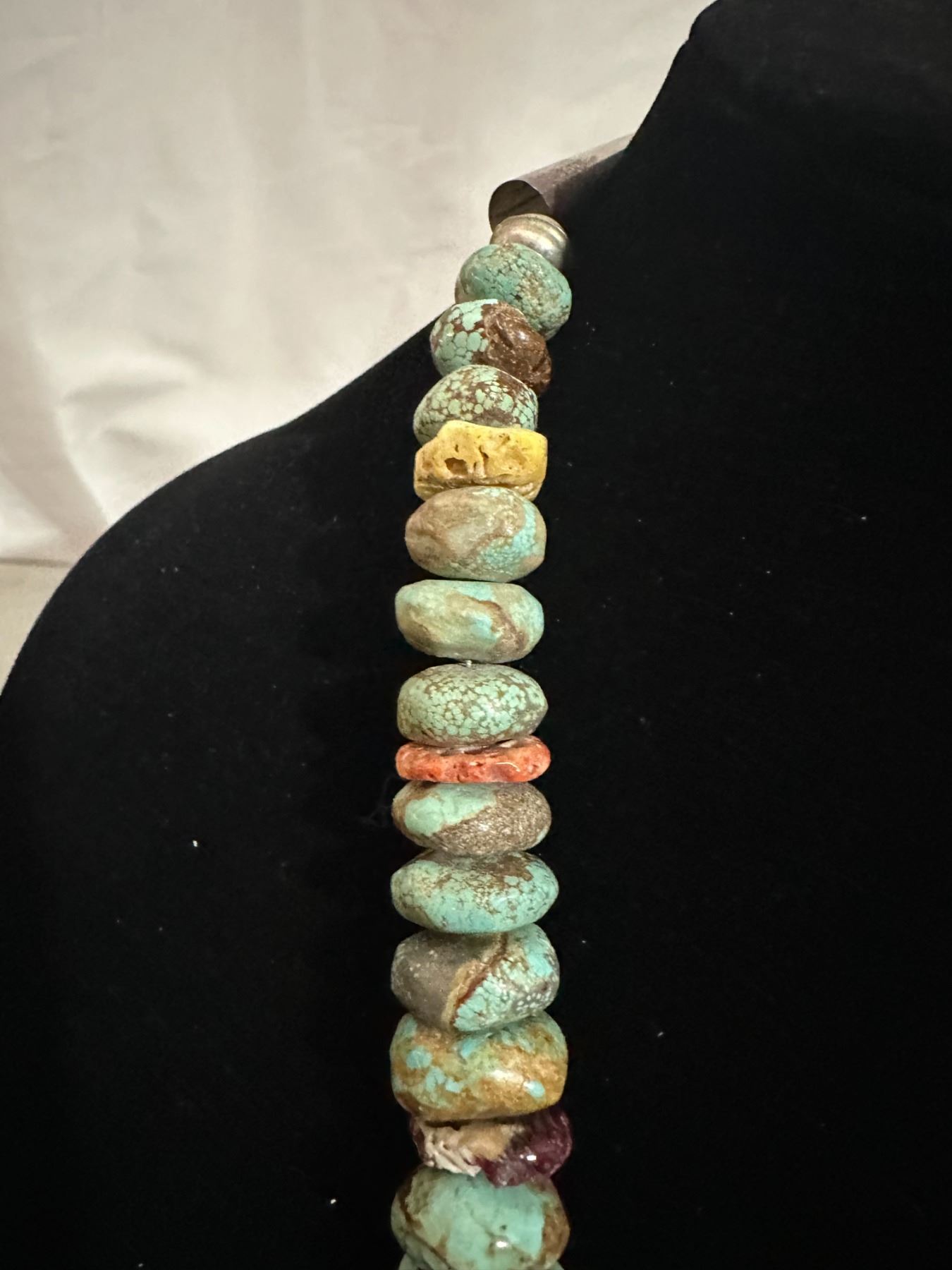 Here is an opportunity to own a true fashion piece for a fraction of what a necklace with Royston turquoise. The pieces of spiny oyster offset the stones to break apart the appearance.