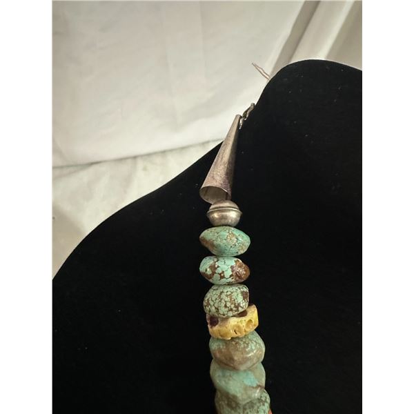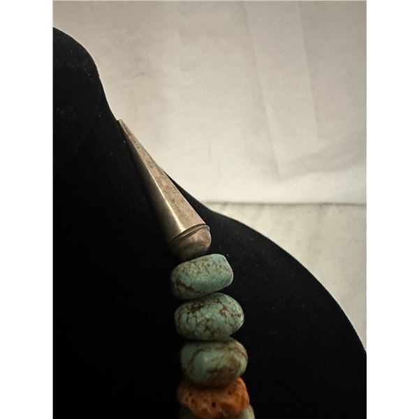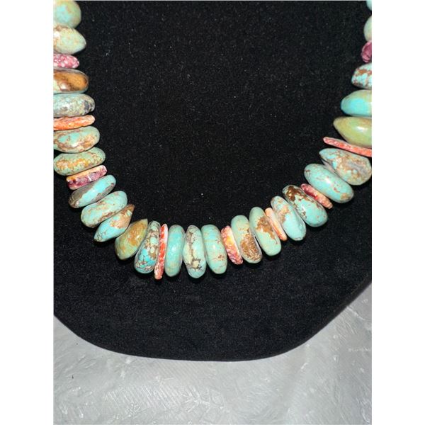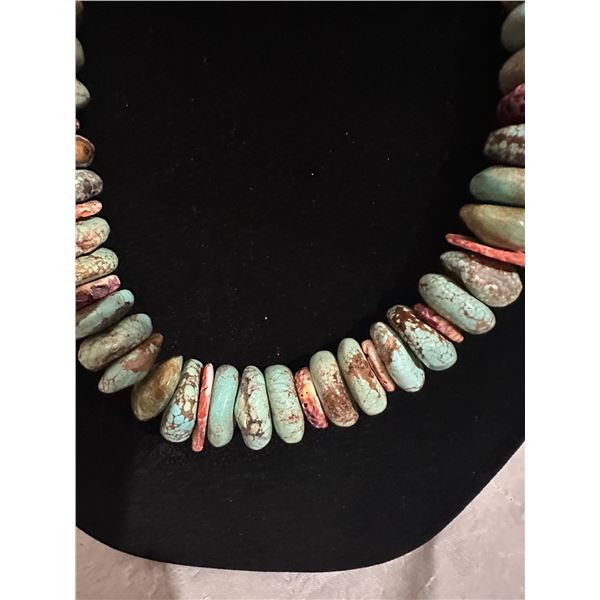 Here is an opportunity to own a true fashion piece for a fraction of what a necklace with Royston turquoise. The pieces of spiny oyster offset the stones to break apart the appearance.