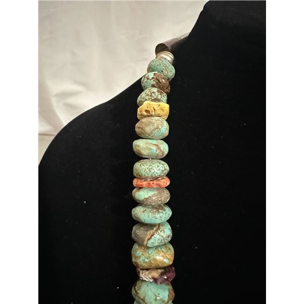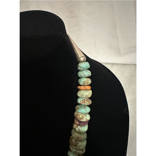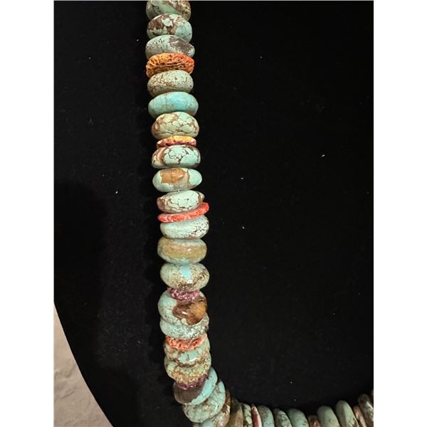 This heavy Large Royston Turquoise / Spiny Oyster has over 60 induvial stone strung on a heavy wire strand withy silver a heavy duty clasp.