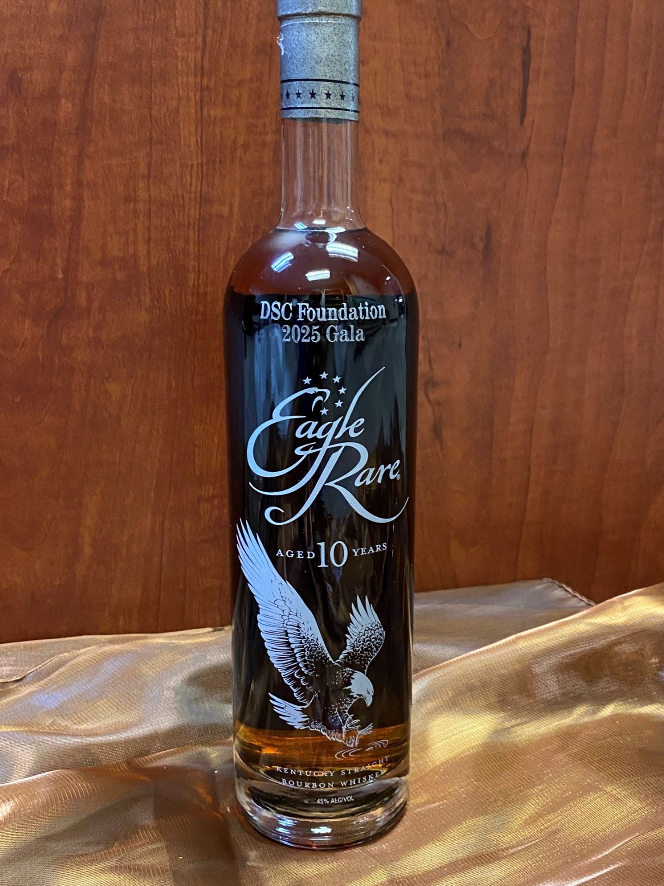 IN ROOM ONLY BIDDING: Eagle Rare 10-year-old Kentucky straight bourbon whiskey engraved with 'DSC Foundation 2025 Gala'. Eagle Rare Kentucky straight bourbon whiskey is masterfully crafted at Buffalo Trace Distillery in Frankfurt, Kentucky, a place with a rich history in American Bourbon. Eagle Rare whiskey is carefully aged no less than ten years, making it a smooth and tasty whiskey. The rareness of this great breed of bourbon is evident in its complex aroma, as well as the smooth and lingering taste. Eagle Rare is a bourbon that lives up to its name with its lofty, distinctive taste experience. DSC FOUNDATION THANKS RUSSELL & MARY EDITH STACY FOR THIS 100% DONATION.