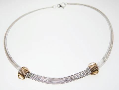 The two-tone necklace is made up of multiple strands of 16 gauge sterling silver wire. The knots are made of contrasting 14k gold fill and are designed to slide making the necklace adjustable. The matching dangle earrings are made with .925 Sterling Silver and wrapped with contrasting 14k gold fill. Each piece of African Elephant Hair Bracelet - Safari Jewelry piece is handmade and hand signed - look for the maker's mark to ensure original quality. DSC FOUNDATION THANKS MARK ROSE RANCH SALES FOR THIS 100% DONATION.