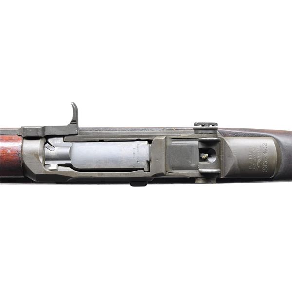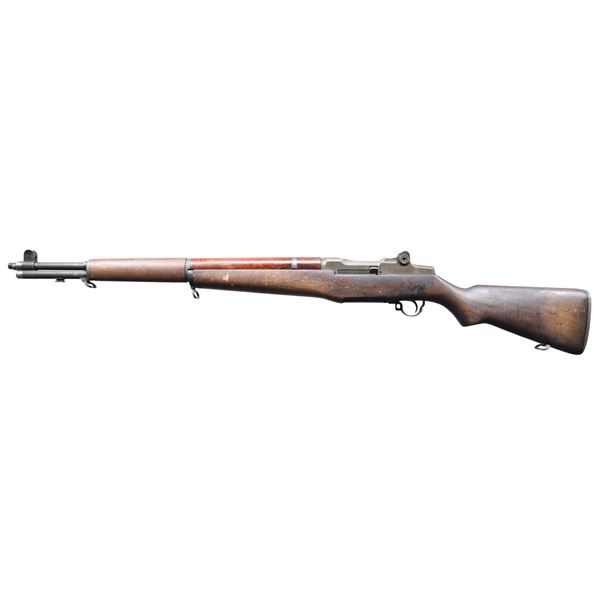 RIFLE. Cal. 30-06. S# 2365402. Bbl. 24". Bbl. marked w/ inverted "10" & "WP" proof. Throat gauges: 2.0. Muzzle gauges: 1.0. Receiver has Winchester markings. Locking bar rear sight. Blade front sight w/ protective ears. Bolt., operating rod, trigger housing & hammer all marked "SA". Stamped trigger guard. Non-matching walnut stock set. Buttstock is faintly marked w/ encircled "P" proof under grip & tiny "crossed cannons" at end of grip. CONDITION: stock set has considerable wear, staining, scratches & handling marks. Rear handguard has added gloss finish. Metal retains a large percentage of its arsenal rework Parkerization except for the gas cyl. lock. Rear sight aperture is broken. Battle range elevation knob is partially present. Bore has worn lands w/ frosted grooves. (25-3895/RW). CURIO. $800-1,200.