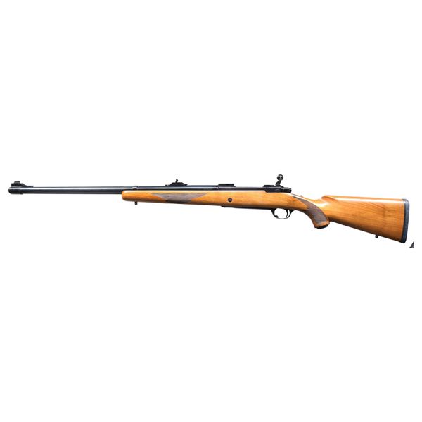 Cal. 458 Win. Mag. S# 73-72309. Bbl. 24" heavy tropical configuration with banded user changeable brass bead front sight and folding leaf rear on raised base. Mfg. 1978 (1968-1992) with barrel "warning marks", tang safety and black buttpad. Intended for dangerous game hunting with checkered Circassian stock having cross bolt recoil lug and sling bases; front base incorporates a barrel band. Receiver factory machined for Ruger scope rings. Trigger guard assembly is classic all blued steel rather than alloy as used on regular caliber models. CONDITION: very good overall with stock handling marks. Rear sight is missing its folding leaf spring. Bluing is very good to excellent with near excellent bore. (25-3333/NW). MODERN. $550-800.