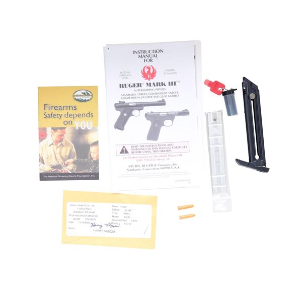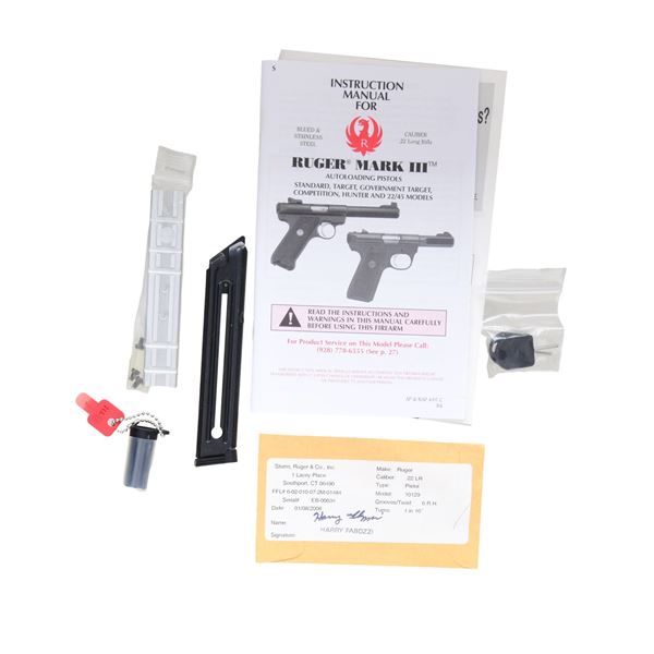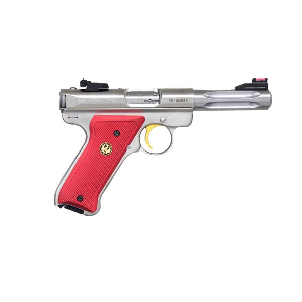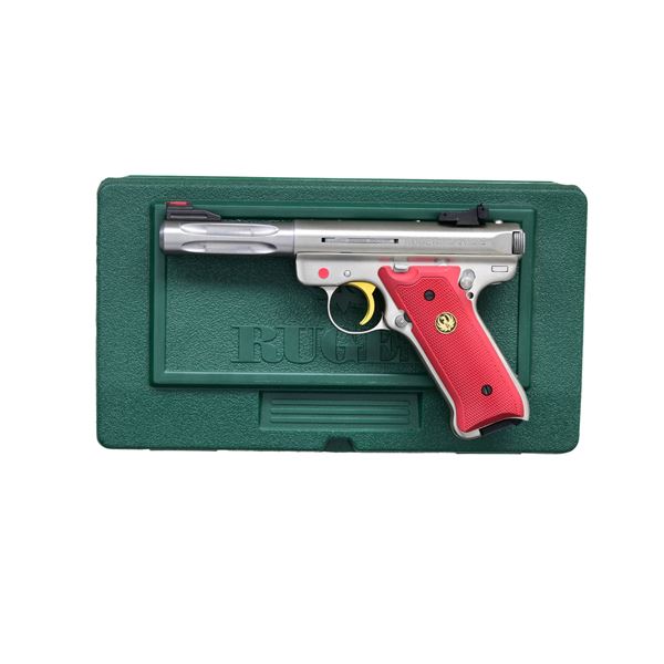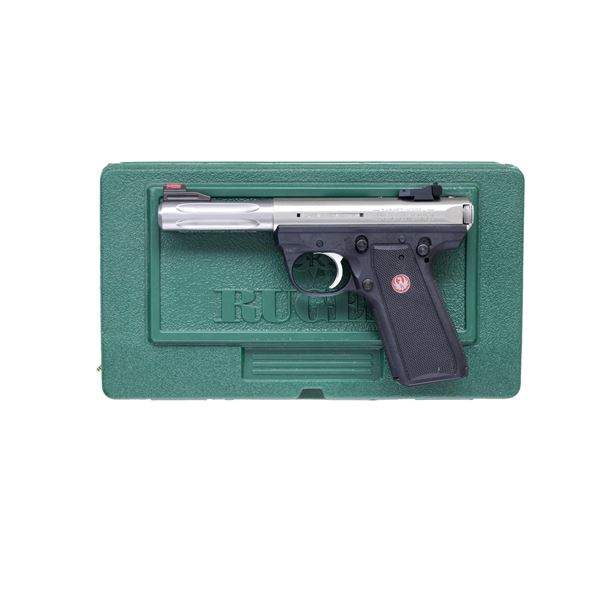MATCHING FACTORY BOXES. ALL: Cal. 22 LR. Stainless finish 4.5" fluted barrel. Hi-Viz sights. MAGS: each pistol has 2-10 rd mags. UNATTACHED ACCESSORIES: each pistol has Factory box w/ paperwork & accessories. CONDITION: both pistols appear near excellent overall including bores. 1) MODEL 10121. S# 270-08310. Mfg. 2006 as Catalog No. KP45MKIII. Black polymer frame & checkered black synthetic grips with red Ruger medallion. (24-2924/MD). 2) MODEL 10129. S# EB-00634. Mfg. 2008 as Catalog No. KMKIII45HEB. Stainless steel frame w/ red checkered grips with Ruger medallions. (24-3458/MD). ALL MODERN. $500-$800.