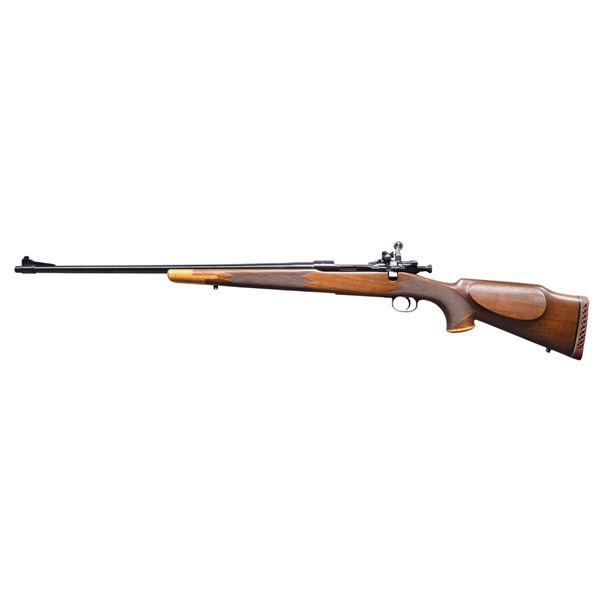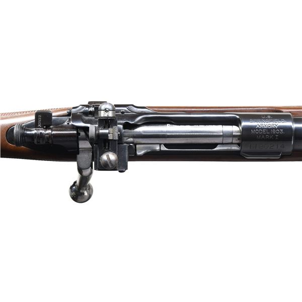 ACTION RIFLE. Cal. 30-06. S# 1120214. Bbl. 24" (4 groove) having Lyman ramped band front sight base with white bead blade. Made 1919 with oval port on left side of receiver rail for installation of a Pedersen Device. Standard military configuration (2 stage trigger) with addition of Redfield No. 70 Series receiver sight having coin slotted "hunter knobs". Polished blued finish with bolt body (including handle) and extractor in the white. Checkered walnut sporter stock with Monte Carlo raised cheekpiece, ventilated Pachmayr recoil pad, detachable sling bases, Maple grip cap and picture puzzle fitted striped Maple forend tip (semi-beavertail). CONDITION: very good overall with highly polished finish. Well done stock set having slight age deformation of recoil pad. Good bore with light wear and faint (even) frosting. (25-3996/NW). MODERN. $400-600.