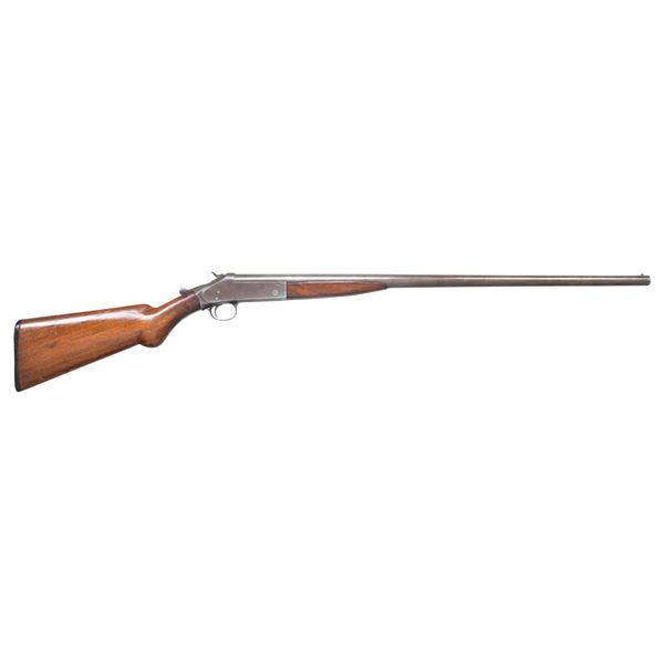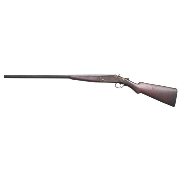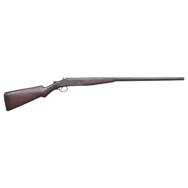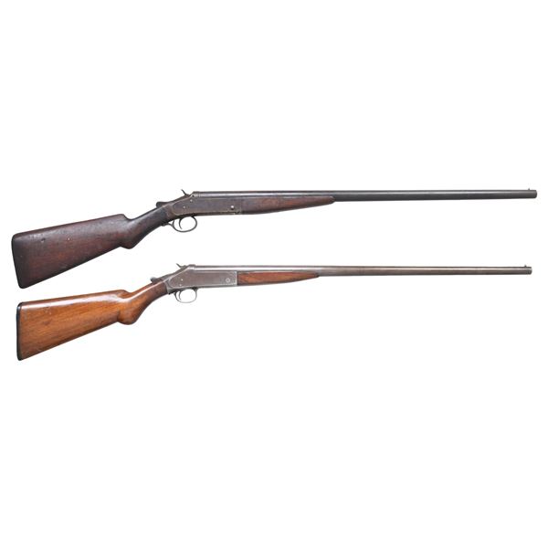 1) IVER JOHNSON CHAMPION. Cal. 16 Ga. NSN. Bbl. 28" w/ front bead. Choke measures approx. Imp. Mod. Action has external hammer & ejector. Hardwood stock set. CONDITION: brown patina metal with spots of corrosion. Wood finish blistering w/ large cracks. Worn buttplate. Pitted bore. (25-2573/MD). 2) HARRINGTON & RICHARDSON. Cal. 20 Ga. S# A111381. Appears to be Model 1900 w/ 28" bbl. Replacement white bead front sight. Bore choke measures IM. External hammer action w/ ejector. Walnut stock set. CONDITION: metal is gray/brown patina appearance with marks. Wood has extra varnish with deep marks. Bore shows light pitting throughout. (25-2574/MD). ALL CURIO. $200-400.