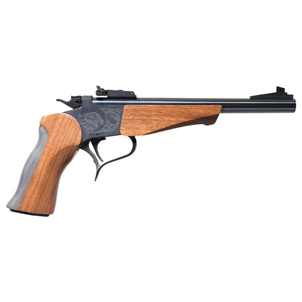 PISTOL. Cal. 44 Mag. S# 431806. Bbl. 10" bull with screw attached Patridge blade on ramped base for front sight and factory adjustable rear. Mfg. first half of 1995 (1967-2000) as blued with "Easy Open" frame. Safety and firing pin selector on top of hammer, Adjustable trigger and puma engraving on both sides of frame. Smooth walnut stock set; sculptured forend with schnable tip and Steve Herrett designed grip having integral recoil cushion on back strap area plus TC logo on black plastic grip cap. CONDITION: all aspects near excellent with like new appearance. (25-3678/NW). MODERN. $450-600.