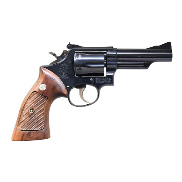 Cal. 357 Mag. S# K712243. Bbl. 4" pinned. Ramped serrated blade front sight. Adjustable square notch rear sight. 6-shot recessed cyl. 1966 made 19-2 revolver. Blued finish with case colored hammer & trigger. Checkered walnut diamond center target grips with silver S&W medallions. CONDITON: grips have a refinished appearance with some areas appearing lighter than others, sharp checkering, a few light dings & some handling marks. Trigger & hammer retain most of their case colors with some operational wear & light oxidation. Balance of metal retains 98% original blue with a few handling marks, a moderate drag line on cyl. & some edge wear. Action functions properly when hand cycled. Bright near excellent bore. (25-4092/MJC). CURIO. $800-1200.