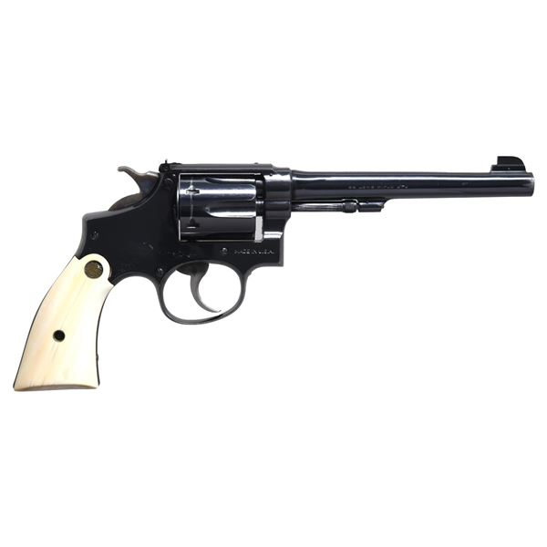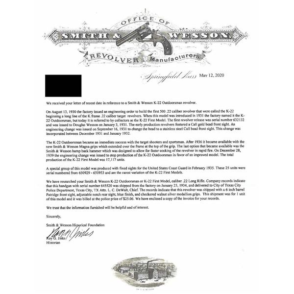 REVOLVER. Cal. 22 LR. S# 645520. Bbl. 6". Patridge front sight with stainless bead. Adjustable square notch rear sight. Matching numbers on grip frame, bbl., cyl. & extractor. First Model K22 Outdoorsman revolver. Blued finish with case colored trigger & hammer. Replacement white colored grips with small gold S&W medallions. UNATTACHED ACCESSORIES: factory letter that states the gun shipped with walnut grips but otherwise confirms its configuration. The revolver was part of a solo shipment to the Texas City Police Department in January, 1934. Also included is a copy of the shipping invoice. CONDITION: grips show some light handling wear. Trigger & hammer retain strong amounts of their case colors with scattered operational wear & light oxidation. Balance of metal retains 90% factory quality reblue with some cleaned oxidation under grips, some scattered edge wear, light scratches & some light minor oxidation. Action functions properly when hand cycled. Bright ver good bore. PROVENANCE: From the Estate of Jon Thomas, Gunsport, LTD. (25-1100/MJC). CURIO. $500-800.