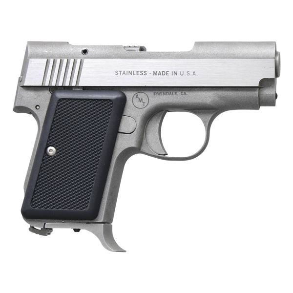 Cal. 380 ACP. S# A95602. Bbl. 2 1/2". Low profile sights. Stainless finish. Checkered black plastic grips. MAGS: 1-5 rd. UNATTACHED ACCESSORIES: matching numbered factory box with paperwork. CONDITION: grips show a couple small light handling marks. Metal shows some light scratches & handling marks. Action functions properly when hand cycled. Very good plus bore with strong rifling. (25-3219/MJC). MODERN. $350-550.
