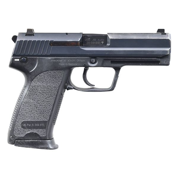 Cal. 45 ACP. S# 25-084960. Bbl. 4 3/4". Tru-Dot sights. Variant 1 USP pistol with left side safety that also acts as a decocker. Left side of slide has "AC" date code denoting mfr. in 2002. Matte black finish. Polymer frame with H&K accessory rail. MAGS: 3-12 rd. Back of spines have added white paint paint identifying what they are. CONDITION: frame shows scattered handling marks & some operational wear. Slide & bbl. retain 90% original matte black finish with extractor turning plum & scattered edge wear. Action functions properly when hand cycled. Bright near excellent bore. (25-3369/MJC). MODERN. $450-650.