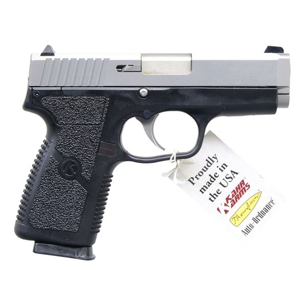 Cal. 9mm Luger S# EJ4080. The pistol features a stainless slide and a black polymer frame with a 3.6-inch barrel. The front sight is a fixed blade, and the rear sight is a fixed notch. The trigger is smooth with a double-action-only configuration. The frame configuration includes a left-side magazine release. Grips are integral to the polymer frame with a textured finish. MAGS: 1-7 Rd. UNATTACHED ACCESSORIES: Factory case, instruction manual, NRA flyer, and lock. CONDITION: Overall excellent. Bore is bright with sharp rifling. MODERN (23-6214) $300-500.
