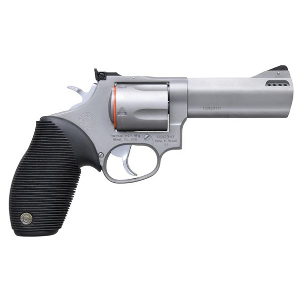 Cal. 44 Mag. S# HS923117. Bbl. 4" ported. Ramped serrated blade front sight with orange insert. White outline adjustable square notch rear sight. 5-shot cyl. Stainless finish. Grooved black rubber grips with Taurus medallions. UNATTACHED ACCESSORIES: matching numbered factory box with manual & keys for internal locking system. CONDITION: all aspects near excellent with some light usage wear. (25-3391/MJC). MODERN. $300-450.