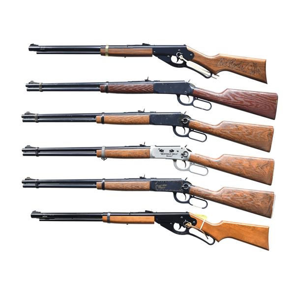 MODEL 1894 WESTERN CARBINES. (1-4.) ALL: Cal. 177 BB. NSN Bbl. 20". 40 shot lever action repeater. Tubular mag. loads on right side of receiver. Wood grained plastic stocks. Standard model as produced from 1961-1986 have black painted finish. Several limited edition were offered over the years. (1). 1894 Standard model. CONDITION: 90% finish showing handling marks. Action has good compression. (2). 1894 Standard model. Reciever has saddle ring on left side. CONDITION: over 80% finish showing finish chips & surface corrosion. Action has good compression. (3). Model 1894 Classic. Action has gold markings & borders w/ saddle ring. CONDITION: over 95% finish. Action has good compression. (4). 1894 Buffalo Bill Scout, 150th anniversary model. Gray finished action has Buffalo Bill marking w/ buffalo emblems. Right side of stock has a "Buffalo Bill - Chief of Scouts" medallion. Approx 2500 mfg. 1996 CONDITION: over 90% finish. Action has good compression. (5). Red Ryder 1938B Ducks Unlimited Commemorative. Cal. 177 BB. NSN. Lever action repeater. Tubular mag loads into bbl. Black painted finish. Action has gold colored marking on right side & saddle & thong on the left. Plastic lever. Gold colored band fastened forearm & walnut pistol grip stock w/ "DUCKS UNLIMITED / GREENWING" medallion on the right side. Limited edition mfg. 1991. UNATTACHED ACCESORIES: factory overbox containing wood grained wall display board w/ plaque & original box , instructions, safety brochure. CONDITION: as new. (6.) Red Ryder 1938B 50th Annual National BB Gun lever action repeater. Cal. 177 BB. Tubular mag loads on bbl. Black painted finish w/ plastic lever.. Left side of action has saddle ring & thong. Hardwood pistol grip stock & forend. Right side of stock has 50th Anniual,1966-2015 marking. Forearm has presentation inscription to original owner "Grandpa Oliff". UNATTACHED ACCESORIES:: original box. CONDITI0N: as new. (7.) Model 225 American Classic slide action repeater. 650 shot, loading tube inserts in bbl. Black painted metal. Wood grain plastic Monte Carlo stock. Mfg. 1991-1993. UNATTACHED ACCESORIES: in plastic wrapped cardboard display w/ instruction. CONDITION: as new. (02-24583-3/DS). NON GUN. $400-800.