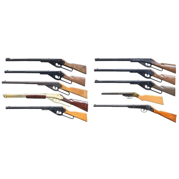 Guns 1-9 all; Cal. BB. (1). Number 100 Model 38, break open single shot. Breaks forward of stock to cock. Sheet metal construction, blue finish, Hardwood stock. Mfg. 1938-41 & 1948-52. CONDITION: over 70% fading blue. Wood shows handling marks & wear spots. Action has strong compression. (2). Model 105 B, lever action repeater. 400 shot capacity at 275 FPS. Black painted sheet metal construction w/ plastic lever. Loads on left side of bbl. Red fiber optic front sight. Right side of hardwood stock is marked "BUCK" below a carved whitetail deer portrait. 1980's mfg. CONDITION: 90% paint, wood shows handling marks. Action has good compression. (3). Model No 1201 lever action repeater. Sheet metal construction w/ gold finish. Loading tube inserts into bbl. Wood grained plastic stocks. Mfg. 1976-77. CONDITION: 75% gold finish showing scratches. Stocks show handling marks. Action has compression. (4). Model 102 Cub, lever action 350 shot repeater. Black painted sheet metal construction Hardwood stock. Loading port is on the bbl. Mfg. 1952-1978. CONDITON: 50% metal finish showing scratches & wear. Stock show handling marks w/ chips at around butt. Action has compression. (5). Model 1105 lever action 500 shot repeater. Black finished sheet metal construction. Wood grained plastic stock. Loading port on the bbl.bbl. Mfg. 1975-1979. CONDTION: over 95% finish. action has good compression. (6). No. 102 Model 36 lever action 500 shot repeater. Blued sheet metal construction. Hardwood stock. Loading port on bbl. Mfg. 1941-42 & 1945-47. CONDITON: metal shows general pitting & corrosion. Stock shows heavy wear & is loose on the frame. Action has strong compression. (7). Model 102 lever action 500 shot repeater. Pained sheet metal construction w/ aluminum lever. Wood grained plastic stock. Loading port on the bbl. CA. 1950. CONDITION: 80% painted finish. Stock shows handling marks. Action has compression. (8). Model 105 B lever action 400 shot repeater. Painted sheet metal construction w/ plastic lever. Wood grained hardwood stock. Loading port is on the left side of the bbl. 1980's mfg. CONDITION: 80% finish showing scratches & spots. Action has good compression. (9). Model 102 lever action 500 shot repeater. Painted sheet metal construction w/ aluminum lever. Wood grained plastic stock. Loading part is on top of bbl. Ca. 1950. CONDITION: over 80% showing scratches. Action has good compression. (10). Double barrel toy gun. Bronze finished sheet metal construction. Break open action. Double triggers. Hardwood stock. Overall length 22". CONDITION: 75% finsh having a sizable area of rust & pitting on the left side. Action has good compression. (02-24583-1/DS). NON GUN. $250-500.