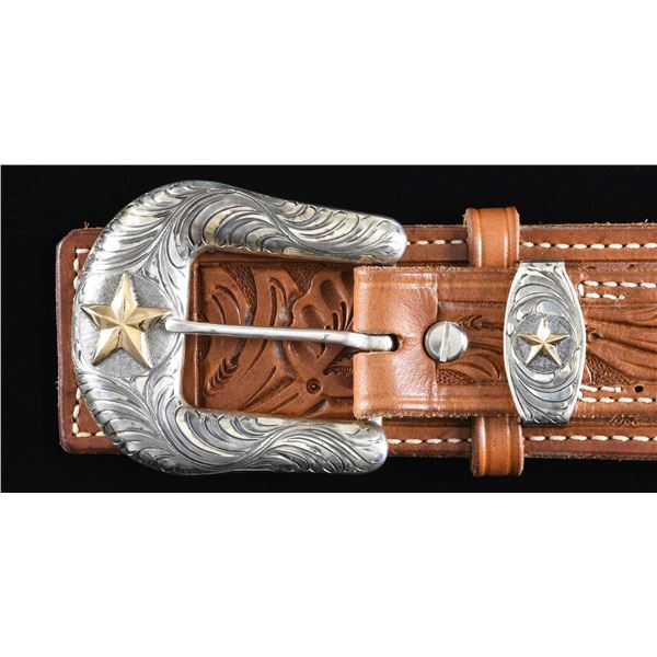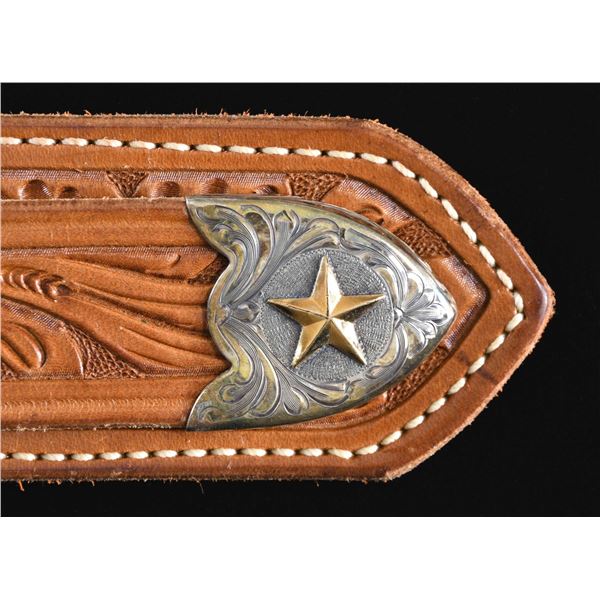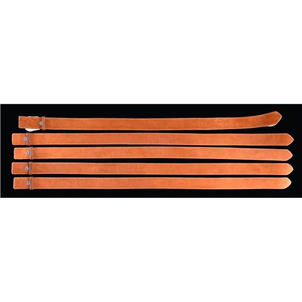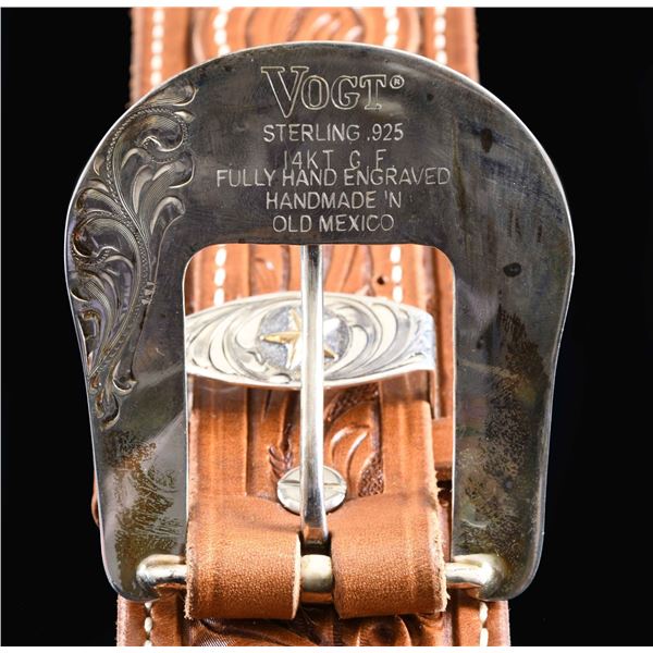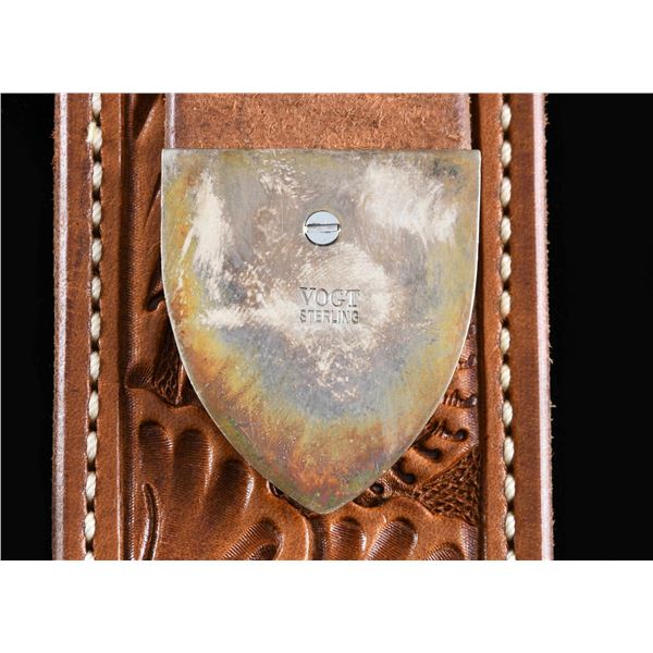 Lot of 5 El Paso Saddlery pistol belts, including: 1) 4 Black Powder belts. Belts are constructed of brown leather, with brass fittings. Belts are marked "2919/ 46C" beneath the buckles. 2) 1 El Paso Saddlery tooled brown leather belt. Belt features floral tooling overall, with VOGT "The Pecos" engraved sterling silver fittings that are embellished with 14kt gold stars. Rear of buckle is marked with the VOGT trademark logo above "STERLING .925/ 14KT G.F./ FULLY HAND ENGRAVED/ HANDMADE 'N/ OLD MEXICO". Belt is marked "42C 2483" beneath the buckle. CONDITION: Black Powder belts are very good to excellent overall. Tooled belt is very good to excellent, with some tarnishing present to the sterling silver. PROVENANCE: From the Estate of Jon Thomas, Gunsport, LTD. (02-24062/MLW). $400-800.