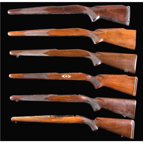 Lot consists of: (1.) Pre-War Model 70 stock with cloverleaf tang having original checkered steel buttplate and sling swivels. Left side of stock has small cut notch for receiver sight clearance. CONDITION: stock has lightly worn original finish and checkering showing scattered small marks. Buttplate has lightly faded blue. (2.) Model 70 Pre-War stock with cloverleaf tang having original checkered steel buttplate and sling swivels. CONDITION: Stock has a dark refinish showing handling marks and lightly worn checkering. (3.) Model 70 Post-War stock with Monte Carlo comb and checkered plastic buttplate. CONDITION: unsanded stock has light coat of added finish over small marks and retains very good checkering. (4.) Model 70 Post-War Monte Carlo stock. CONDITION: sanded and refinished stock has weakened checkering with shortened LOP over an aftermarket ventilated black Winchester pad. (5.) Model 70 Post-War Monte Carlo stock with red ventilated pad as found on Magnum calibers. CONDITION: sanded and refinished stock has worn checkering. Both sides of stock along action have added "V" shape and square white inlays. (6.) Model 70 Post-War low comb stock that is thinned with fluted tip having added checkering, fluted plastic grip cap, and non-original Pachmayr pad. Stock retains original swivel bases. CONDITION: stock has good added finish and checkering show scattered scratches and marks. (02-24462-7/DS). $500-800.