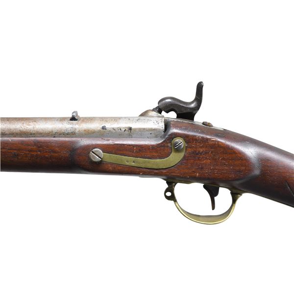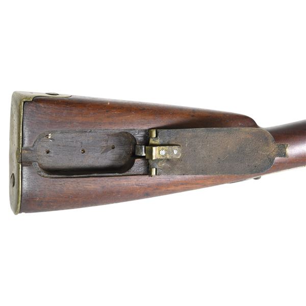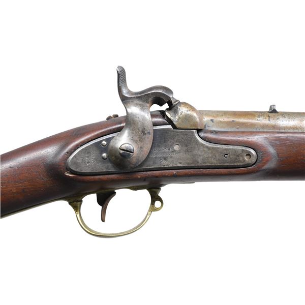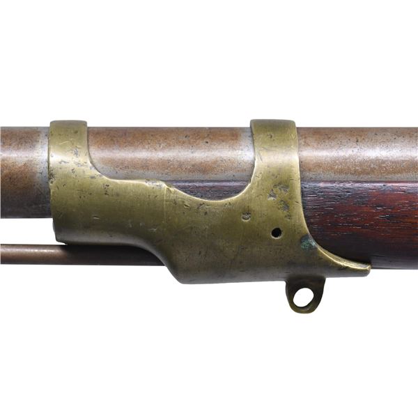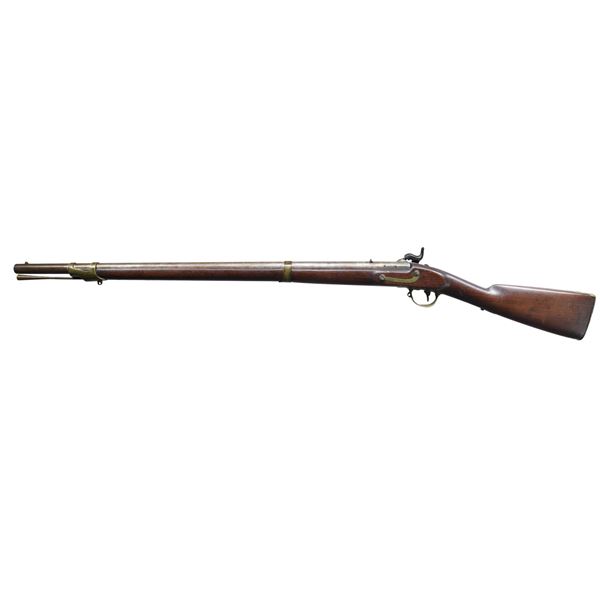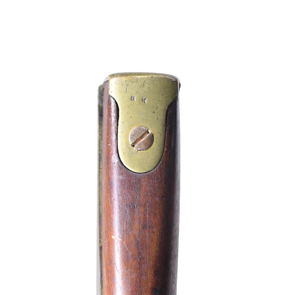 Cal. 54. NSN. Mississippi style rifle, 33" barrel with indiscernible proofs, lock stamped "DICKSON / NELSON & CO. / C.S." and "ALA / 1864", brass furniture has "GK" stamped of unknown origin. Stock is most interesting having crudely cut toolbox reminiscent of Palmetto rifles without extra nipple cut out, brass band springs are held by friction with no retaining springs. UNATTACHED ACCESSORIES: copy of Doug Jones, excellent ASAC article telling history of this rare maker. CONDITION: good as configured, ramrod is new replacement, one lock screw is non functioning wood screw, good mechanics, good dark rifled bore. (01-26898/JS). ANTIQUE. $4,000-6,000.