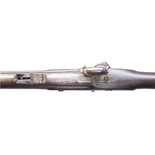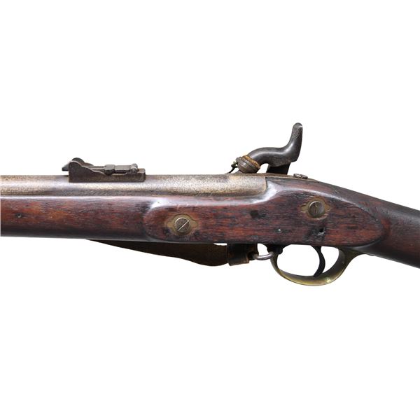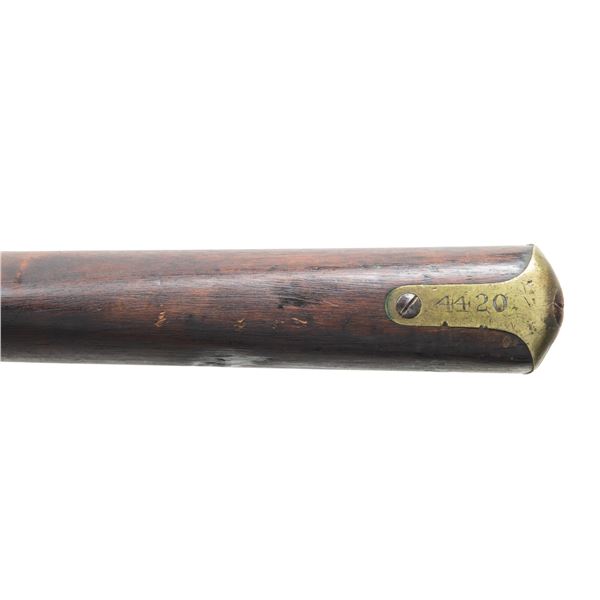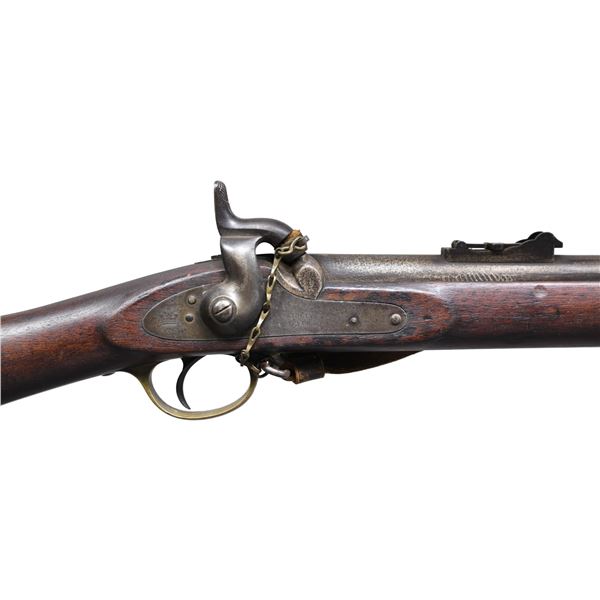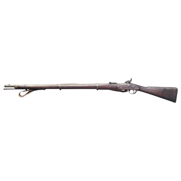 ENFIELD RIFLED MUSKET. Cal. 577. S# 4420. Standard pattern 1853 Enfield rifled musket, the most prolific longarm weapon of the Confederate infantryman during the Civil War. Lock marked: "1861 / L. A. Co." forward of hammer, and rear of hammer with a crown and "VR". Stock has round cartouche which reads "London Armory Company / 1861". "4420" engraved on buttplate tang. Accompanied by period brown leather sling and chained original nipple protector. CONDITION: good to very good overall, appears complete & original including sling swivels & rear sight which are often missing. Stock has erosion, makers cartouche is visible in outline only. Mechanics fine, clear smooth bore with worn rifling. (01-26902/JS). ANTIQUE. $3,000-4,000.