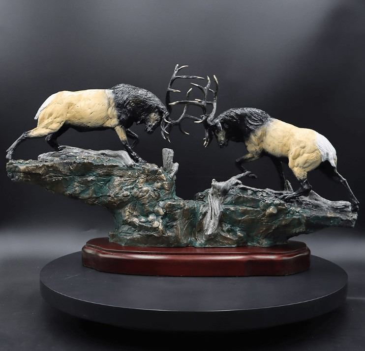Laran envisioned a powerful scene of two elk locked in battle, with one holding the high ground. He was inspired by the intensity and elegance of the moment and knew he had to bring this idea to life, striving to capture the essence of their struggle in his creation.