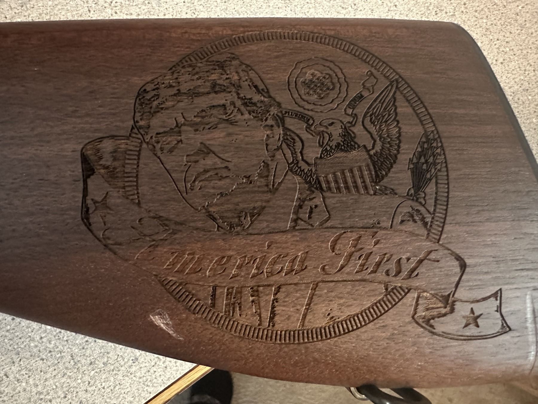 The Trump Save America Thompson starts as a Model 1927 Tommy Gun, chambered in .45 ACP. It is entirely manufactured in the USA from quality steel and American walnut. On the right side is engraved “President Trump”, and the Presidential Seal. On the left, “Save America 45th”. The beautiful wood furniture is engraved with the American flag, President Trump, Liberty Bell, and Statue of Liberty images.