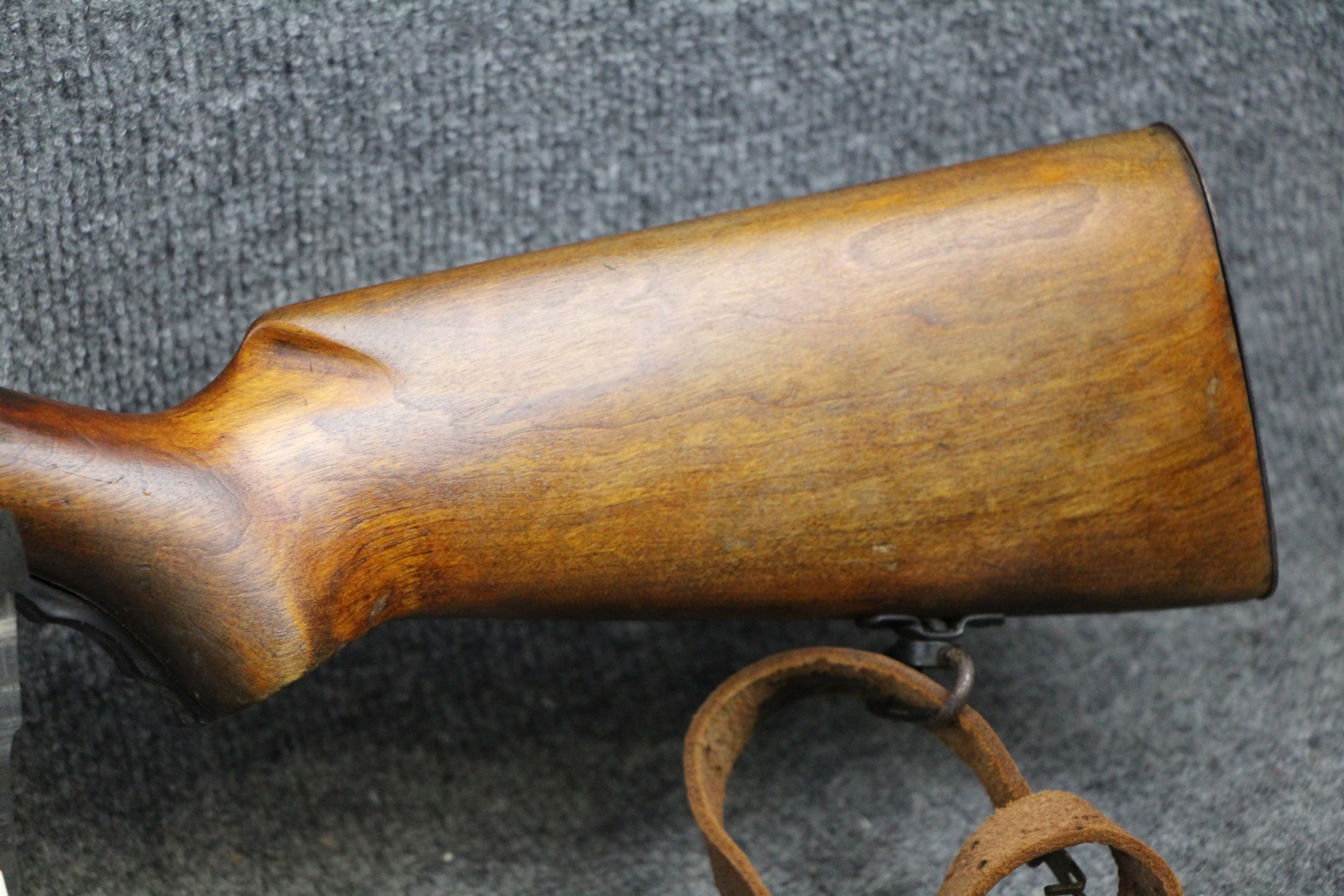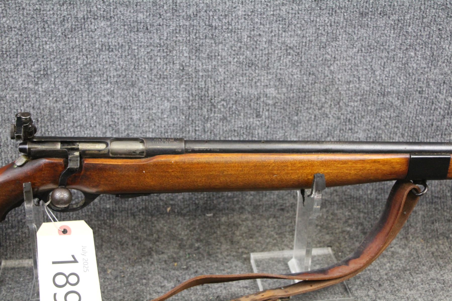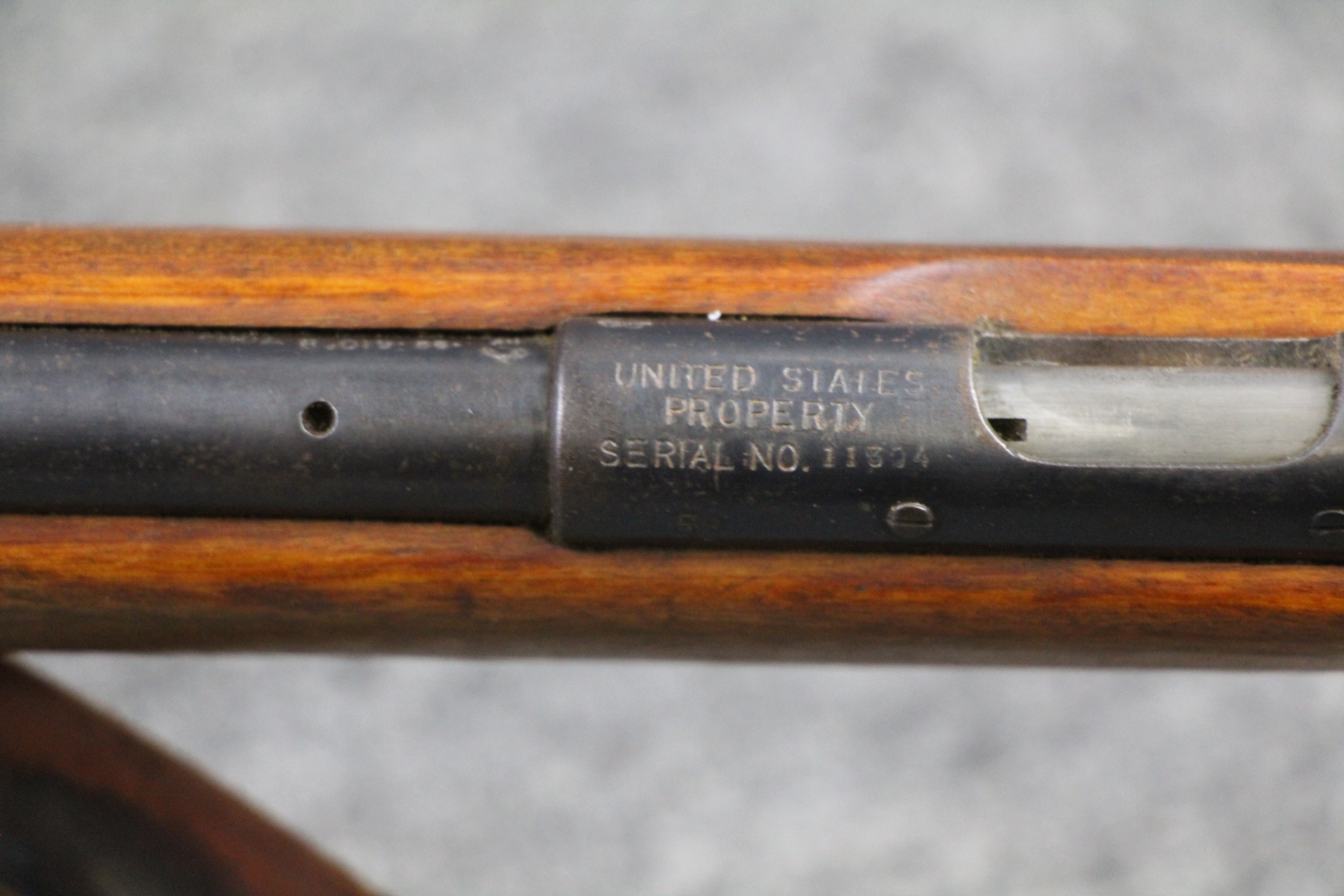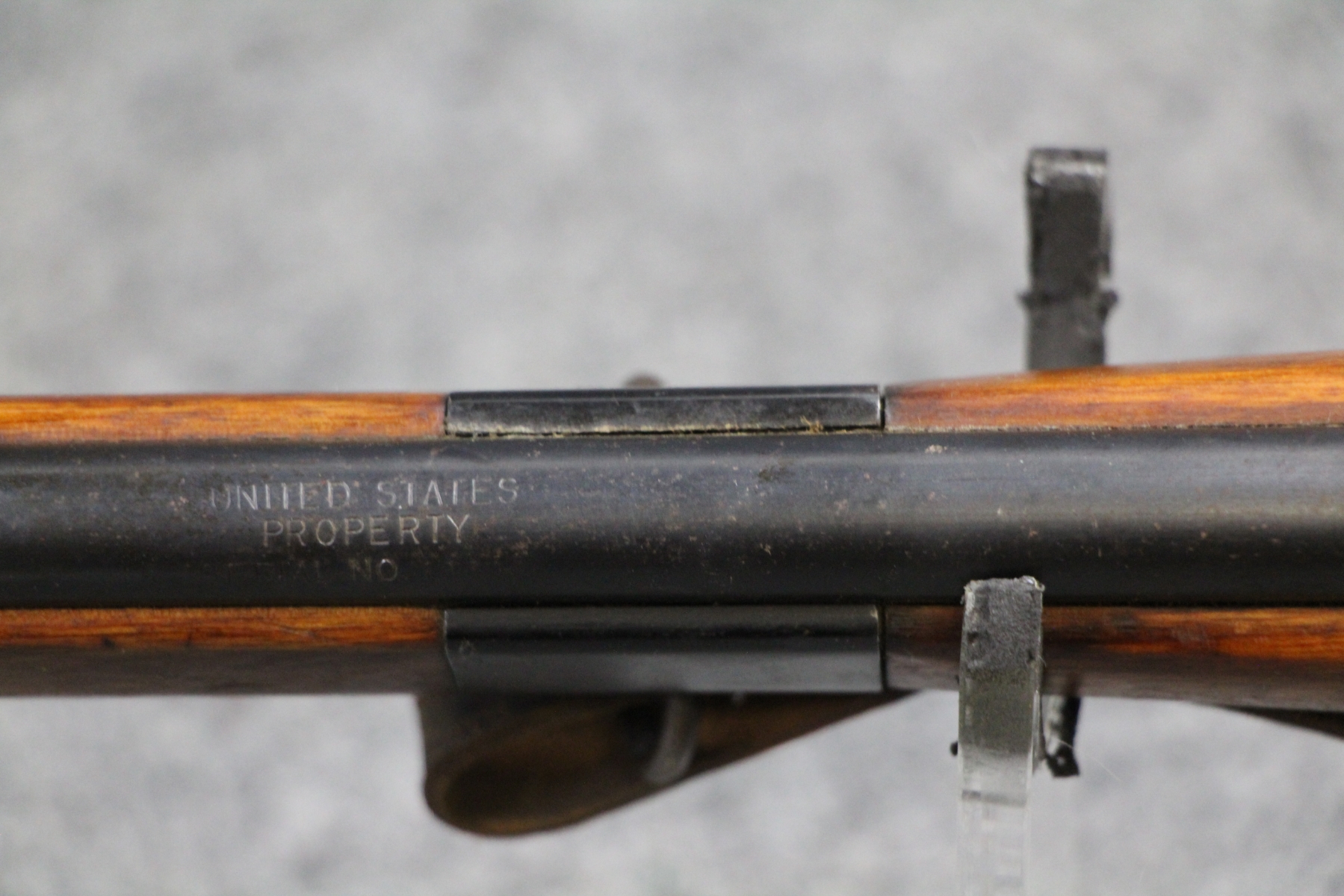 1st one I have ever seen. See link below. Some surface rusting. Some shallow gouges on the stock. Military leather sling. Stamped United States Property. Micrometer rear sight. Steel box mag.