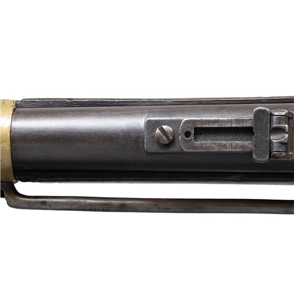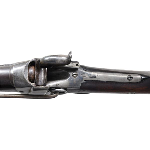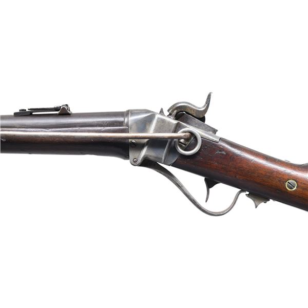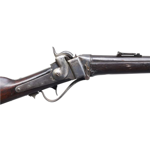 CARBINE. Cal 52. S# 15001. Standard brass mounted configuration, 37.75" overall, 21.5" barrel, adjustable long range rear sight, brass blade front sight, "SHARPS /PATENT / 1852" on lock, "SHARPS / PATENT / 1848" on back of frame and S# on tang, 9" long saddle bar. Famously nicknamed "John Brown" Sharps, as many shipped to Kansas Abolitionists May 1855, one John Brown shipped carbine was close in S# to subject, 15012. Many guns in this serial range (14800-15100) were issued to 1st California cavalry, and 1st & 2nd NY Veteran cavalry regiments. Consecutive S# 15000 was issued to 2nd NYV cavalry in 1864 from National Archives records. CONDITION: good to very good overall, all original and matching, honest well used example. Barrel overall has gray/plum patina, traces of case color on frame, smooth cleaned brass. Mechanics are fine, but Maynard capping device missing cover screws and spring, not functional, crisp rifled bore. (01-27010/JS). ANTIQUE. $2,500-3,500.
