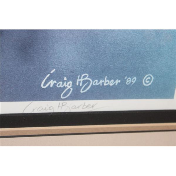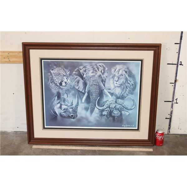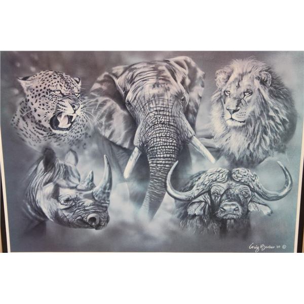 Very Nice "Big Five" Print of a painting signed in Pencil and numbered #65/950 by the artist Craig Hilton-Barber. It has been displayed in a lovely 38" Long x 31" Wide Wooden Frame with Glass. Craig Hilton-Barber was born and raised on a cattle ranch in Zimbabwe surrounded by Africa's natural wonders. He has been painting since childhood and immigrated to Australia in 2009. Barber's work is highly sought after by wildlife enthusiasts and collectors alike. To see a video compilation of the artist's work click the link below: