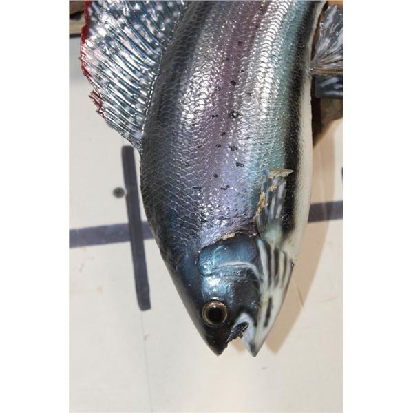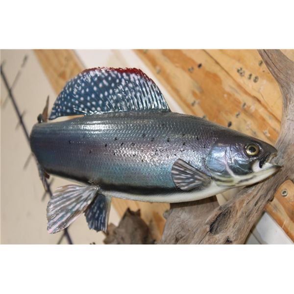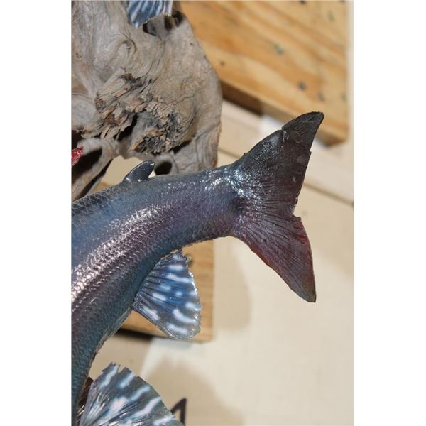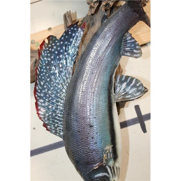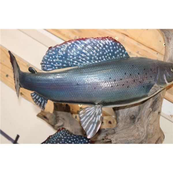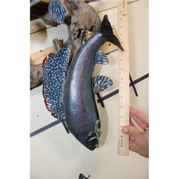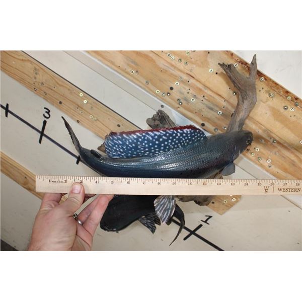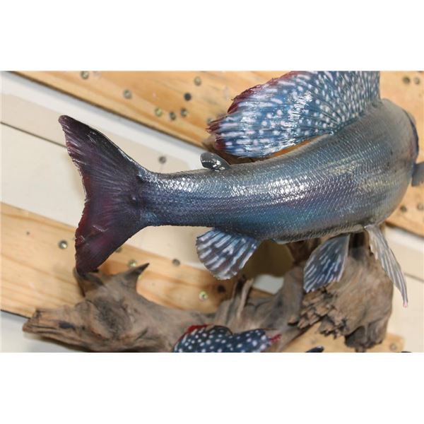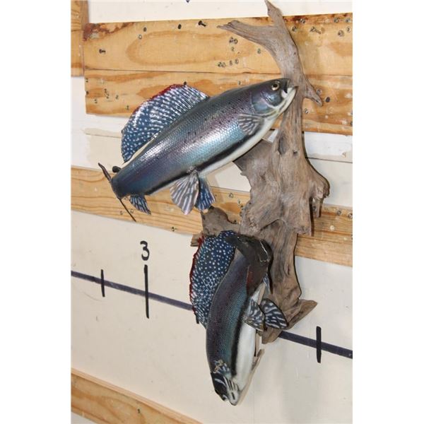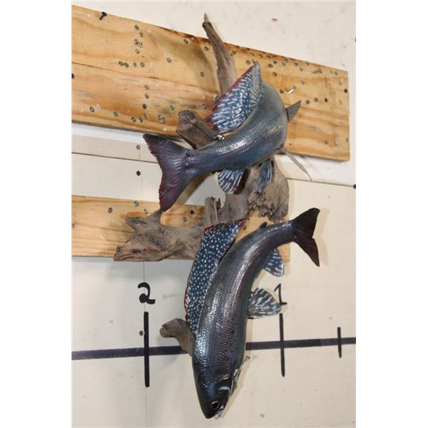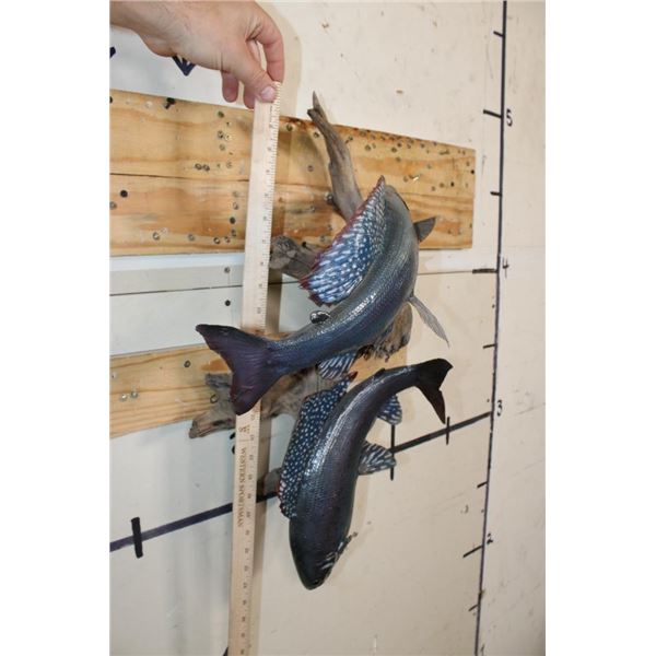 2 *Real Skin* Artic GRAYLING Fish on a Driftwood Wall Hanger. The lower Grayling has front fin damage. The upper Grayling is in Good Condition. TAXIDERMY FISH