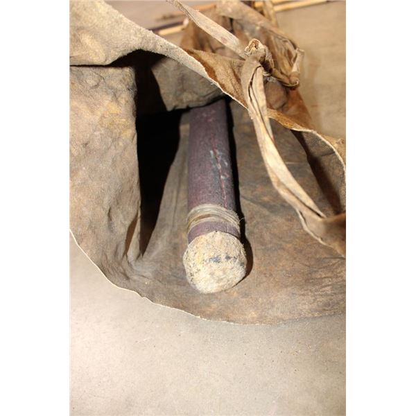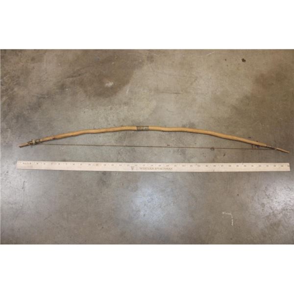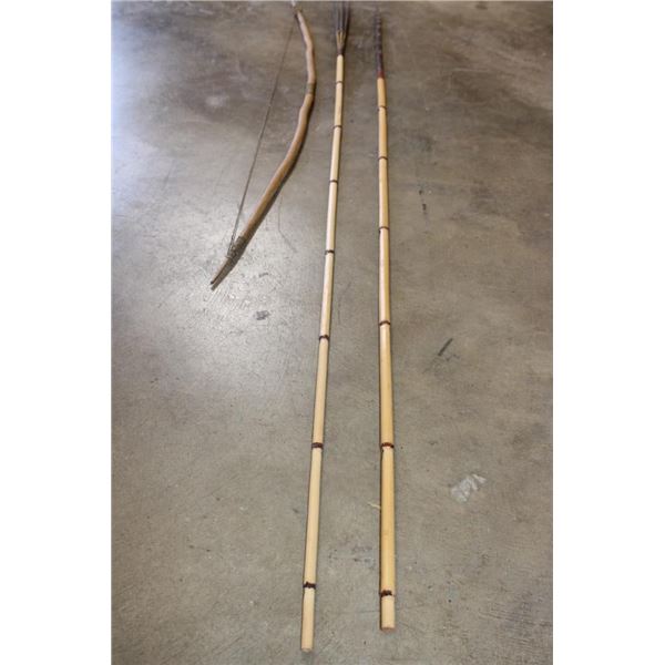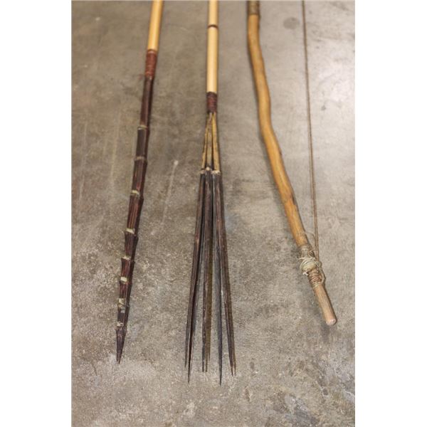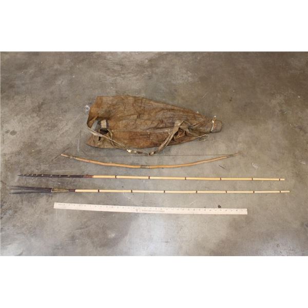 1 Primitive African BOW and 1 Leather QUIVER with 2 small African SPEARS. One of the Spears is for fishing and measures 54" Long. (ONE$) COLLECTIBLE AFRICAN ARTIFACTS