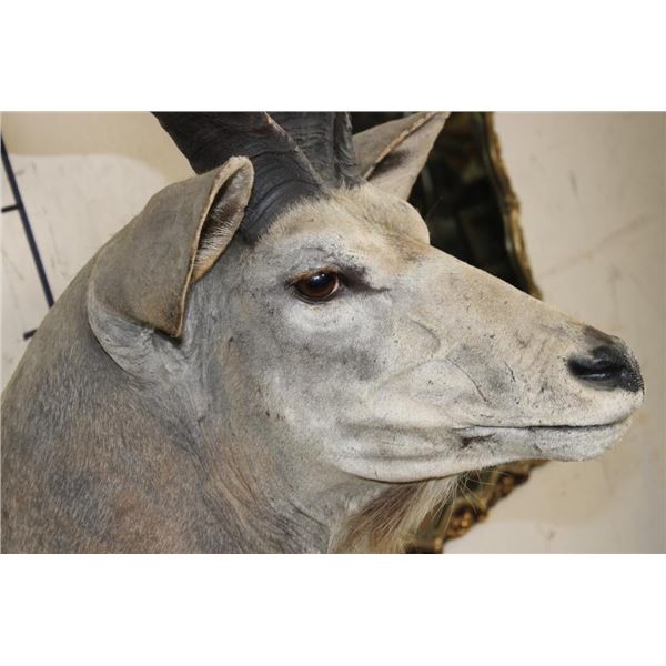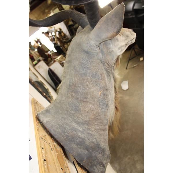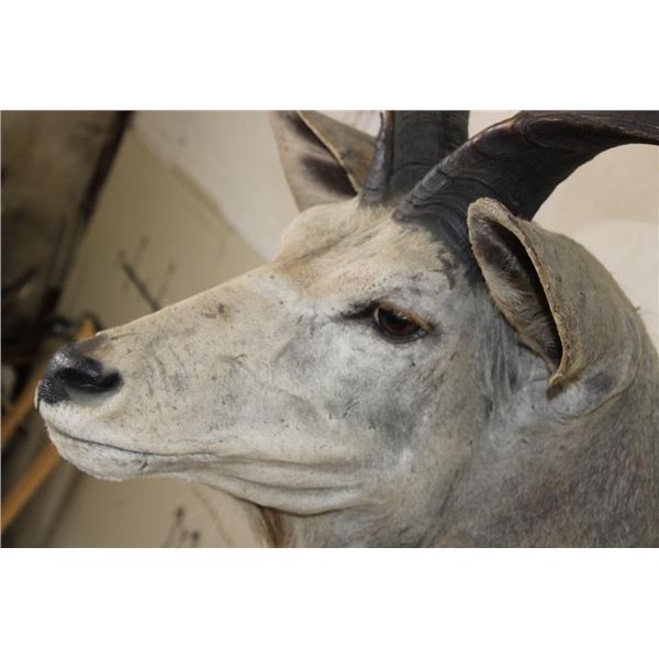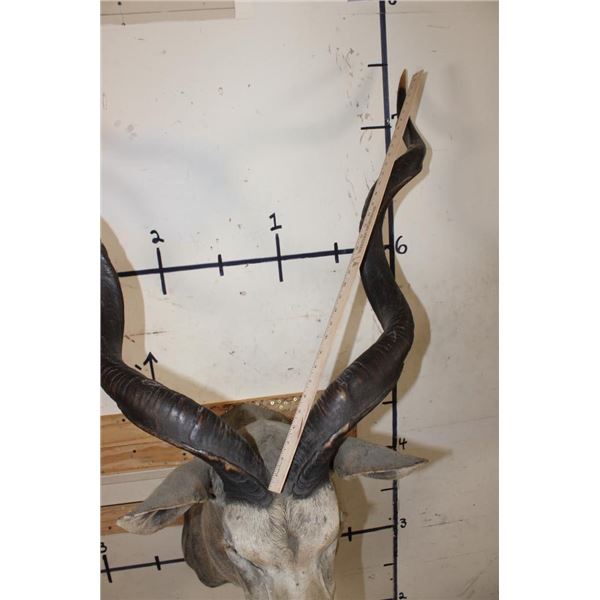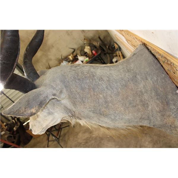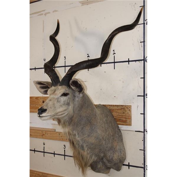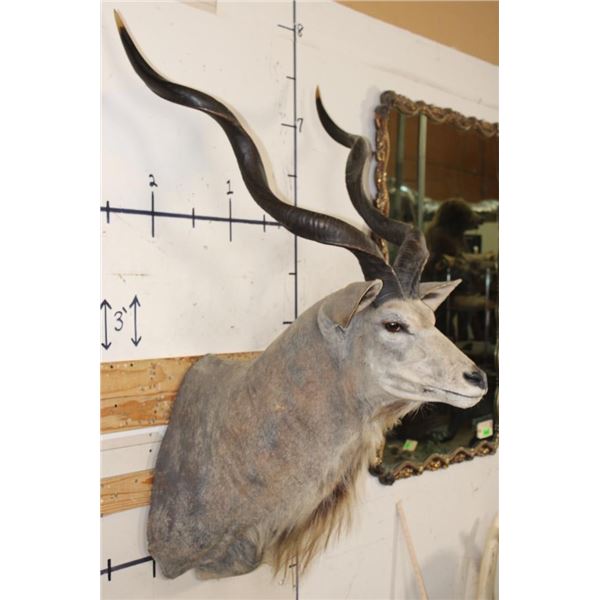 Big KUDU Shoulder Mount. The Left Horn measures 46.5" around the Spiral Ridge and the Right Horn measures 46" around the Spiral Ridge. It has a few rubs and blemishes. TAXIDERMY