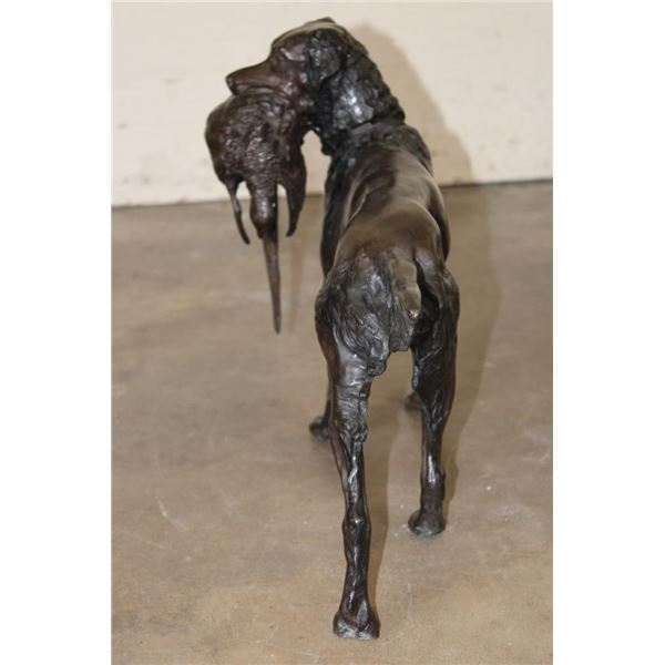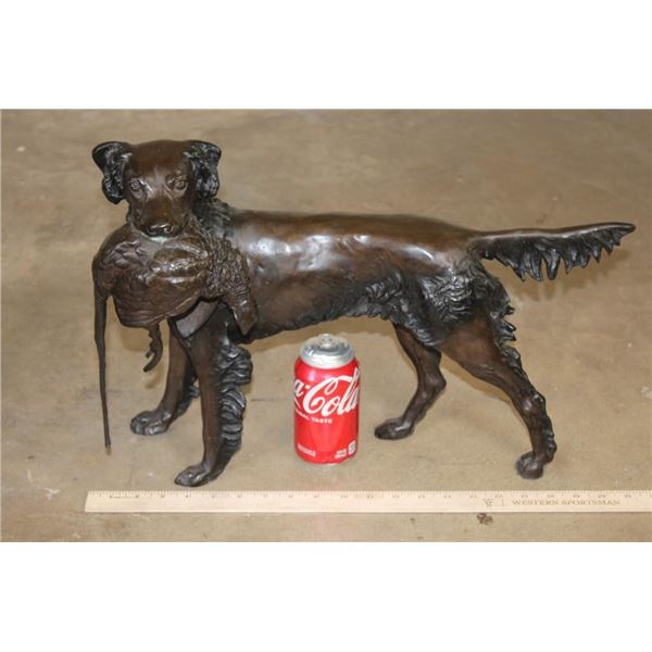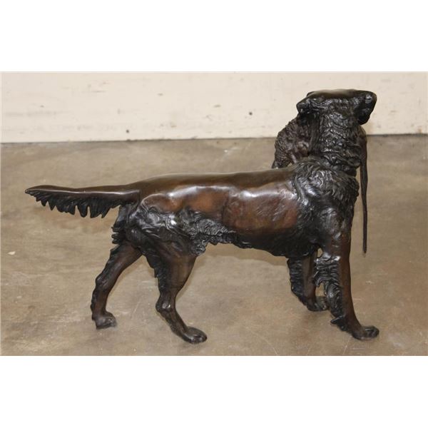 Big Bronze Hunting Dog with a Pheasant in its Mouth. It measures 20" Long x 8" Wide x 14.5" Tall. The Total Weight is 22 lbs 4 oz. COLLECTIBLE BRONZE SCULPTURES AND STATUES