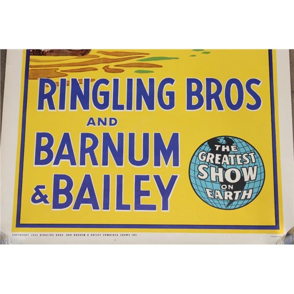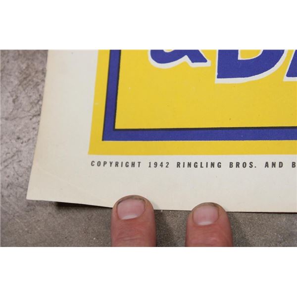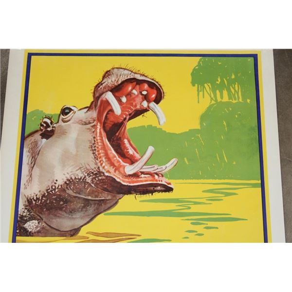 Original "Ringling Brothers Barnum and Bailey Circus" Advertisement Lithograph from 1942. It has bold colors and an incredible Hippo image. The Total measurements are 28" Tall x 19.25" Wide. It is in Very Good Condition for its age. No Frame. This early 1940s Giant Hippo artwork is particularly desired by collectors and interior designers alike for its beauty and detail. COLLECTIBLE ADVERTISEMENTS AND POSTERS