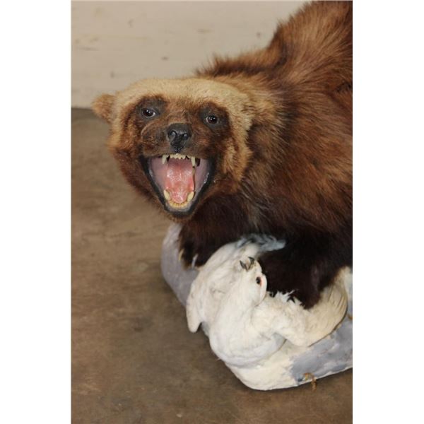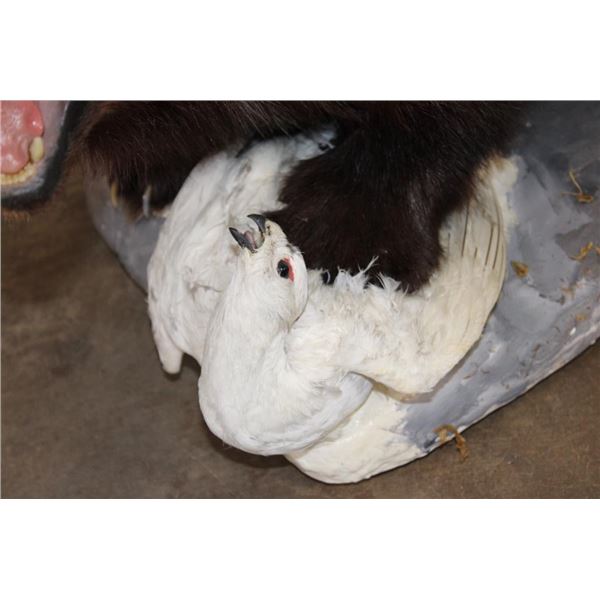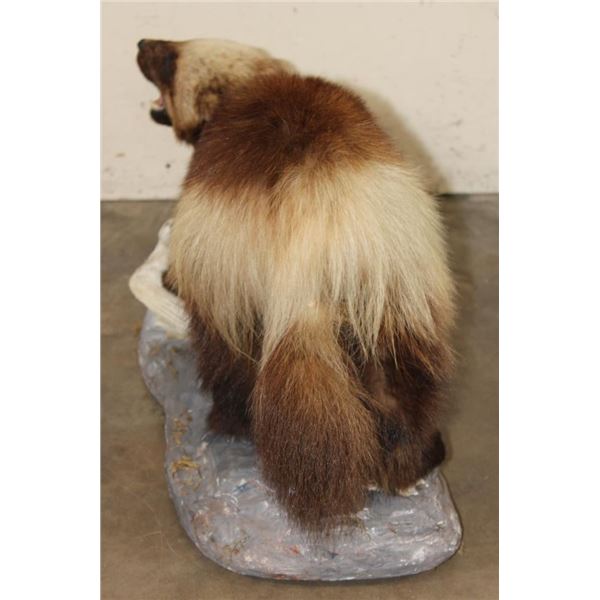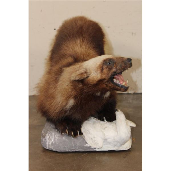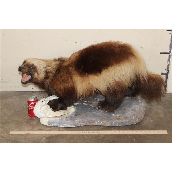 Nice Older Life-sized WOLVERINE on a Base with a ROCK PTARMIGAN. It measures 32" Long x 15" Wide x 17" Tall. It is in Good Condition. TAXIDERMY