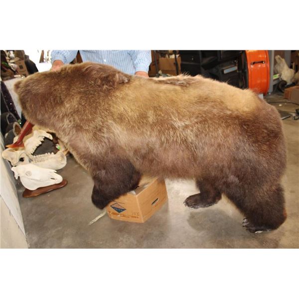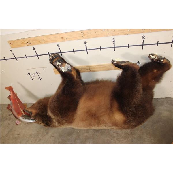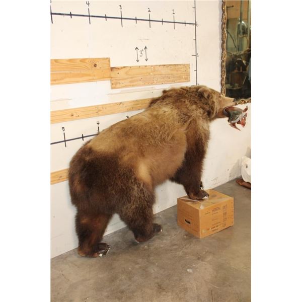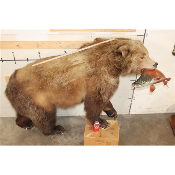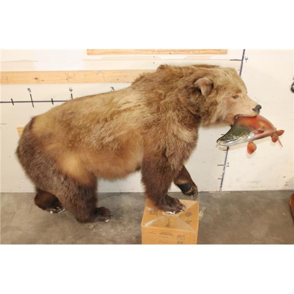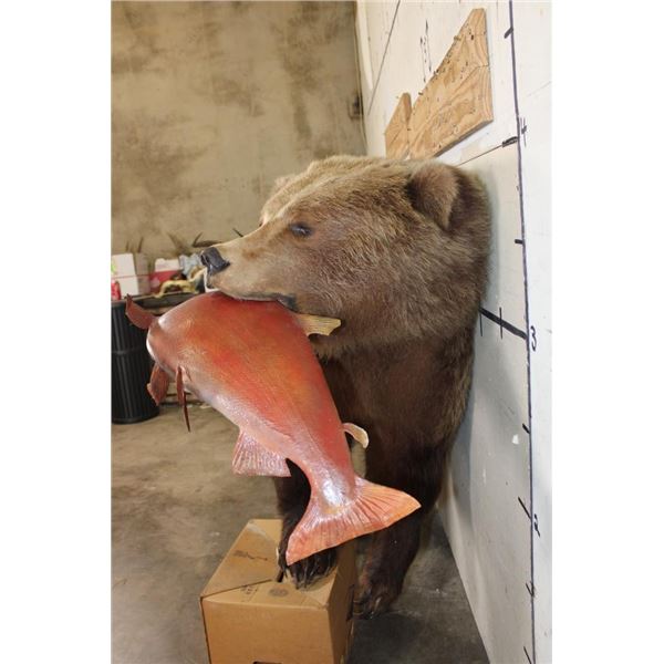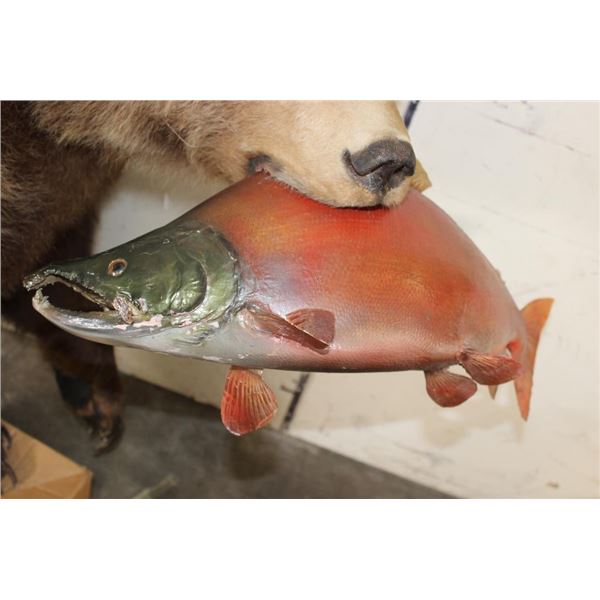 Life-sized GRIZZLY BEAR or BROWN BEAR with a *Real Skin* Sockeye SALMON with All its Claws! It measures 77" from the Nose to the Tail. The Total Mount measures 74" Long x 24" Wide x 40" Tall. This was cut from a Diorama it has No Base and No Bolts. TAXIDERMY