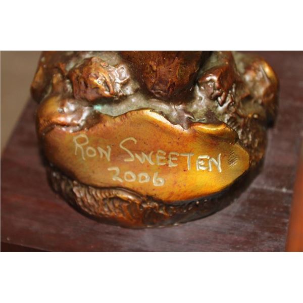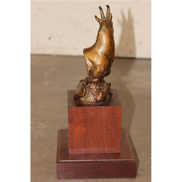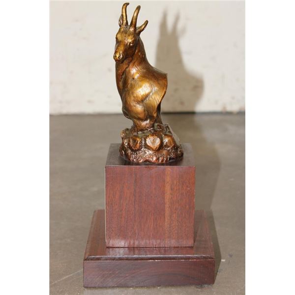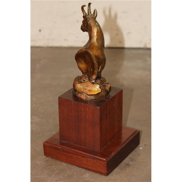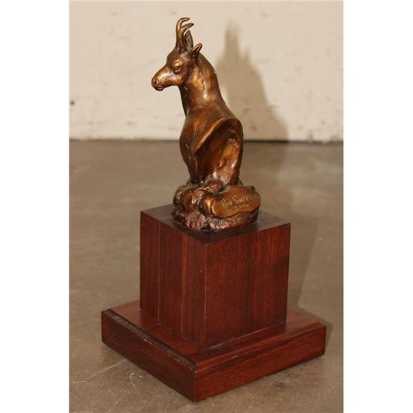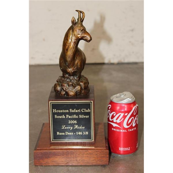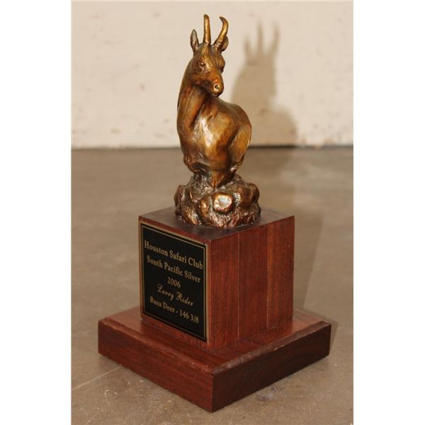 Original Bronze Trophy signed by the artist "Ron Sweeten 2006". The Bronze is a Chamois, the trophy is for a 146 3/8 Rusa Deer. It measures 12" Tall x 6" Wide x 6" Depth. The Total Weight is 5 lbs 2 oz. The Plaque reads "Houston Safari Club, South Pacific Silver 2006, Larry Rider, Rusa Deer- 146 3/8". COLLECTIBLE BRONZE AWARDS AND TROPHIES