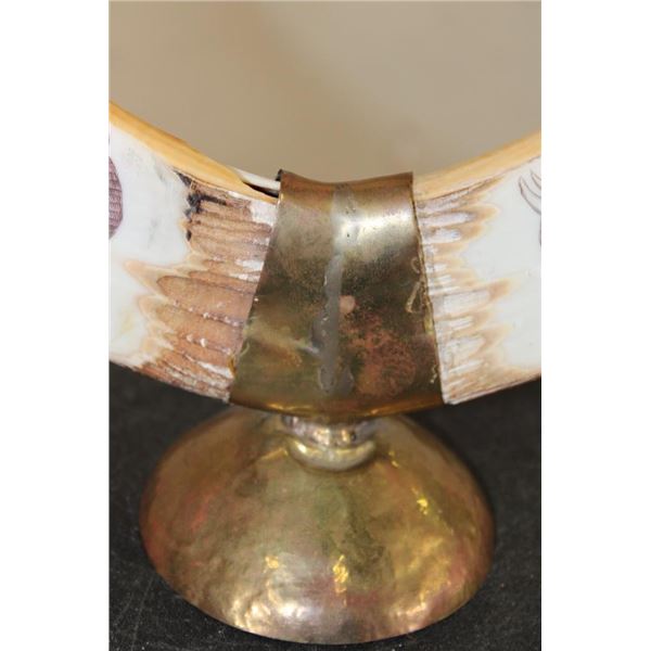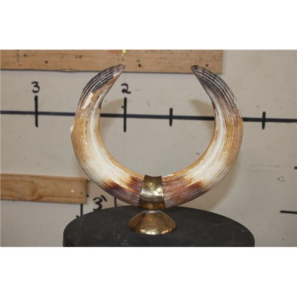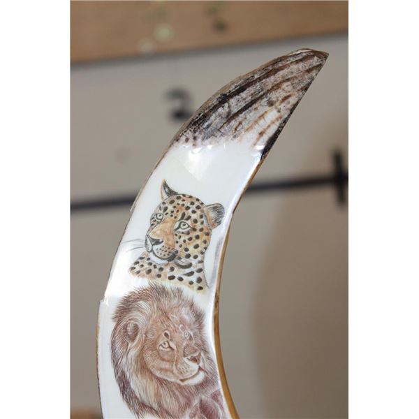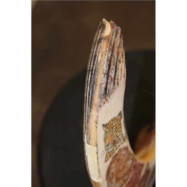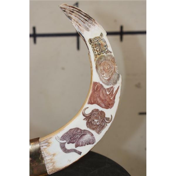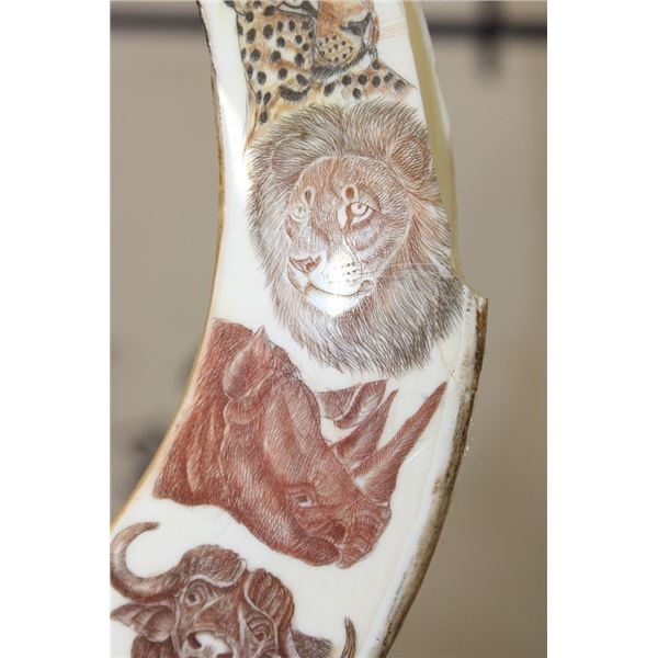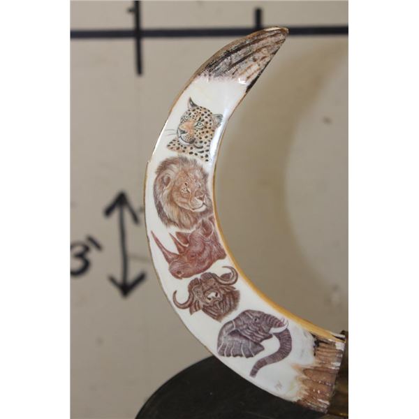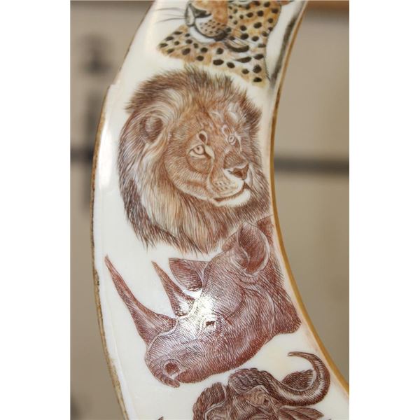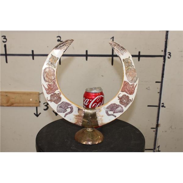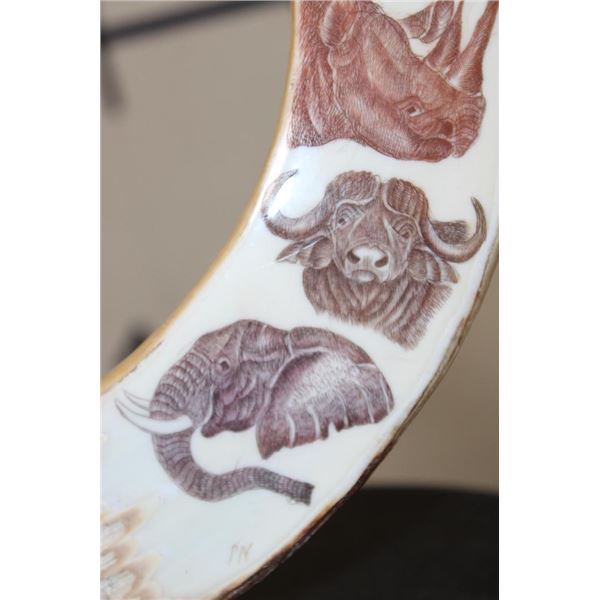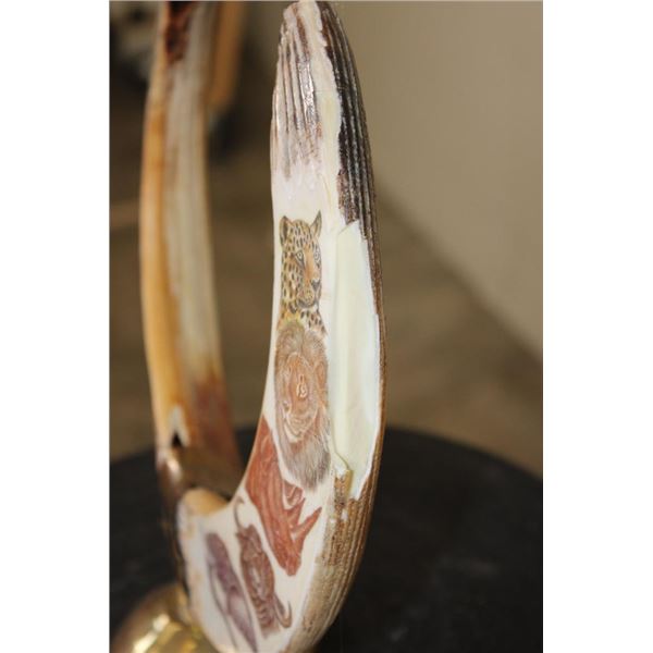 2 Scrimshawed HIPPOPOTAMUS IVORY Tusks on a Brass Display Stand. The Tusks depict a mirror image of the "Big 5" Animals that have been delicately and expertly carved. It has been signed "PN" by the artist. This beautiful work of art measures 11" Wide x 11.5" Tall. It has some chips that add rustic character to the piece. COLLECTIBLE AFRICAN ART AND TAXIDERMY ART