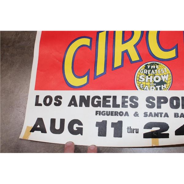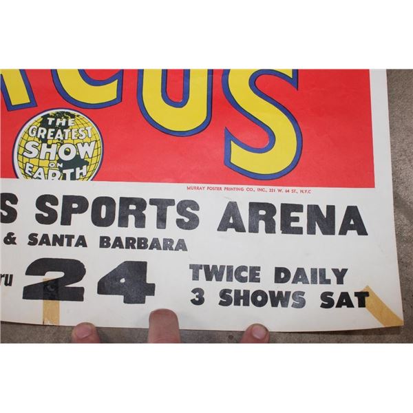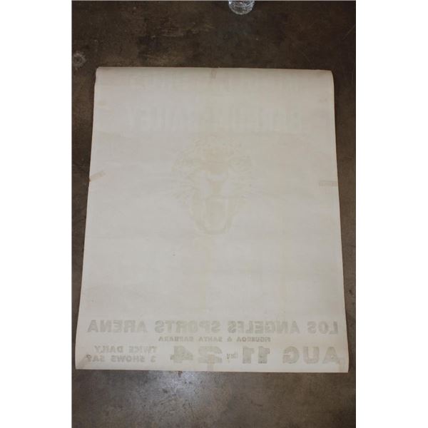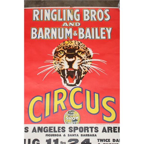 Original "Ringling Brothers Barnum and Bailey Circus" Advertisement Lithograph from 1942. The Total measurements are 27.75" Tall x 22" Wide. It is in Very Good Condition for its age. No Frame. This is the iconic "Snarling Leopard Head". This stunning poster is among the first of the posters which John Ringling North commissioned Norman Bel Geddes Studio to produce. Bel Geddes's studio office was located in Rockefeller Center and he was known as a pioneer of modernist industrialist design. The probable actual designer/artist of this poster was George Howe, a prominent architect who became a partner a the Bel Geddes Studio in 1941. COLLECTIBLE ADVERTISEMENTS AND POSTERS