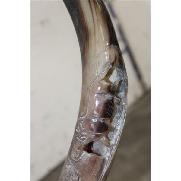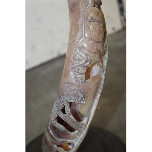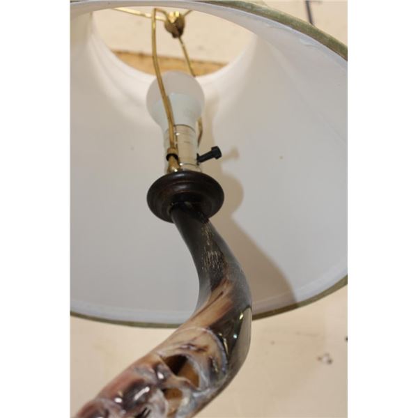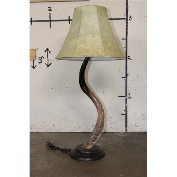 Nice KUDU Horn Lamp. It has a Cape Buffalo Scene carved into the Kudu Horn. It measures 3' Tall x 17" Wide. TAXIDERMY LAMPS AND HOME DECOR