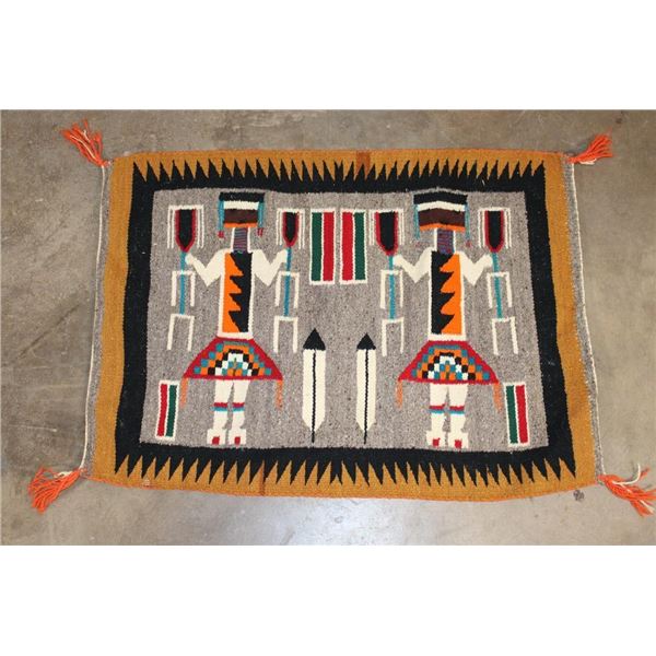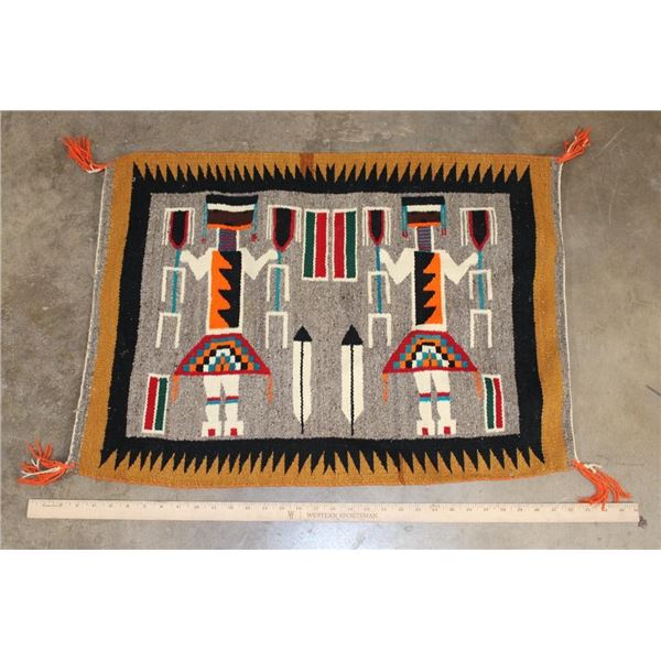 Small Mid-Century Hand-woven NAVAJO Yei Rug. It measures 30" Long x 21.5" Wide. Navajo Yei rugs, also sometimes called Yei Be Chei rugs, depect the Yei, which are supernatural beings or deities in Navajo culture. COLLECTIBLE NATIVE AMERICAN TEXTILES AND RUGS