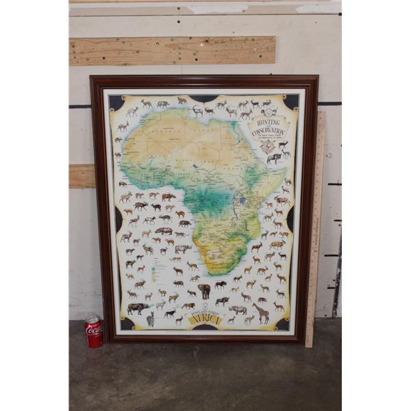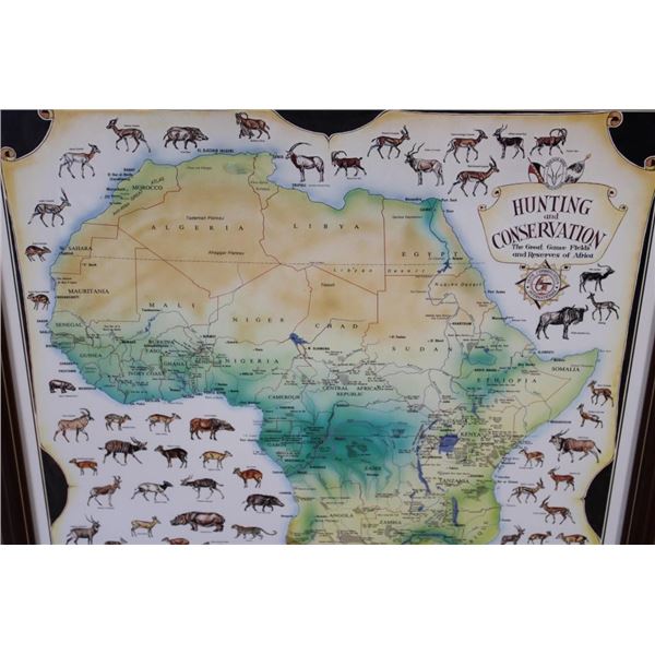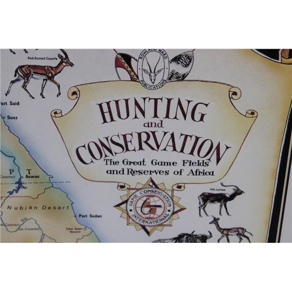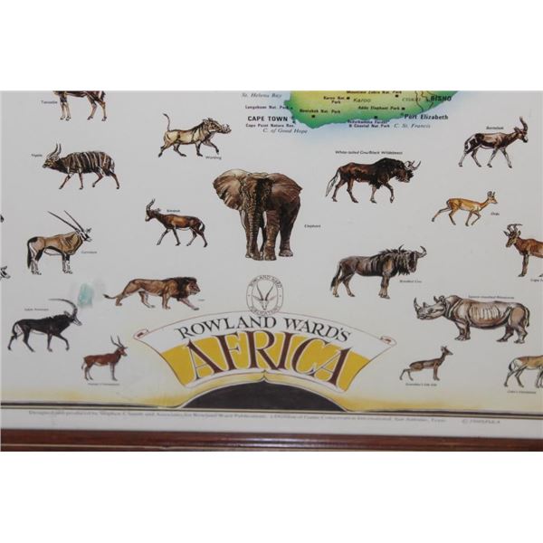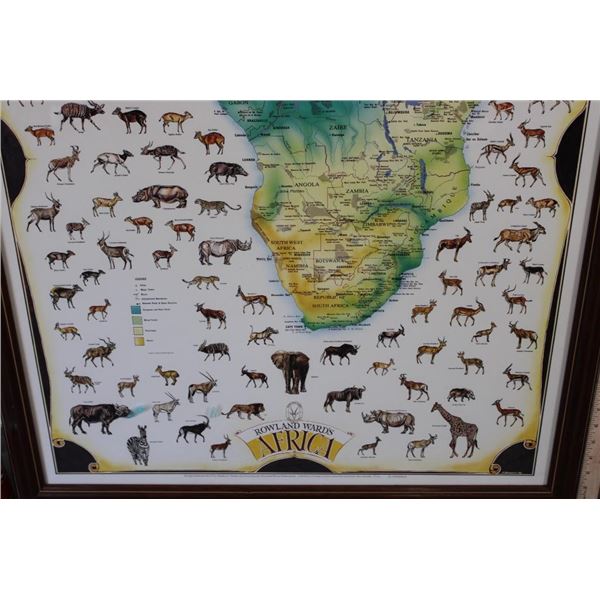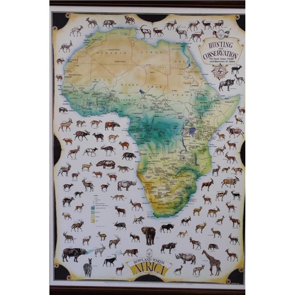 "Rowland Ward's Africa" "The great game fields and reserves of Africa" Map Print by artist E. Buckley 1988. It is displayed in a Wood and Glass Frame that measures 41" Tall x 31" Wide. This Map has incredible artwork of the African animals with their proper name underneath. It was "Designed and produced by Stephen J. Smith and Associates for Rowland Ward Publications, a division of game conservation international San Antonio, Texas 1988". COLLECTIBLE AFRICA MAPS AND AFRICAN ART