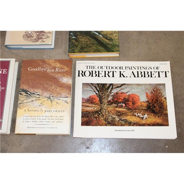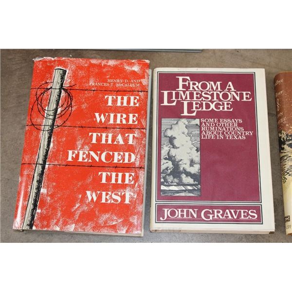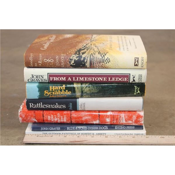 7 Books. 1981 "Blue and Some Other Dogs" signed by the Author John Graves. 1959 "Goodbye to a River" by John Graves. 1980 "From A Limestone Ledge" by John Graves. 1973 "Hard Scrabble" by John Graves. 1965 "The Wire That Fenced The West" by Henry D. and Frances T. McCallum. 1965 "Rattlesnakes" by J. Frank Dobie. 1976 "The Outdoor Paintings of Robert K. Abbett" Introduction by Gene Hill. (ONE$) COLLECTIBLE BOOKS