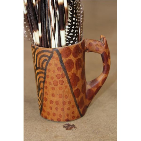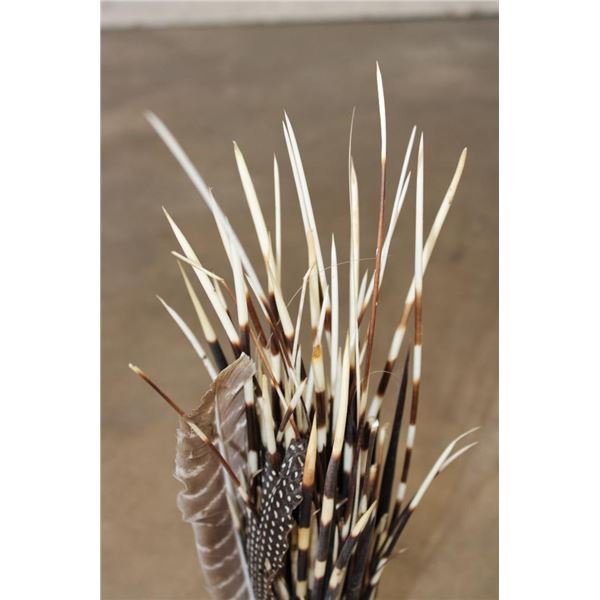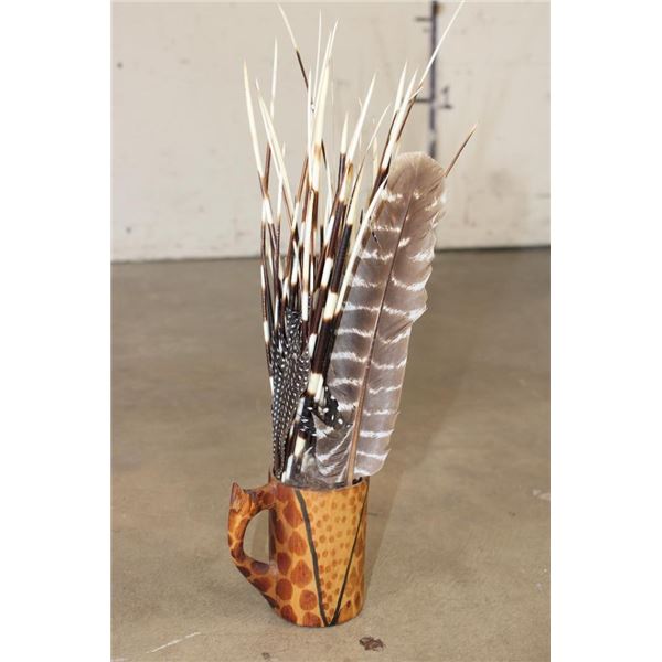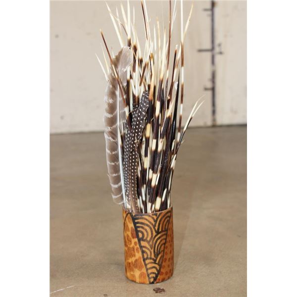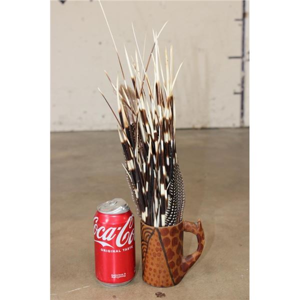 Over 50 African PORCUPINE Quills and 4 GUINEAFOWL Feathers in a Wooden Decorative Mug. (ONE$). TAXIDERMY and AFRICAN HOME DECOR