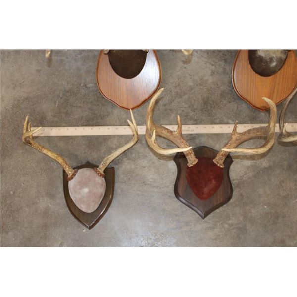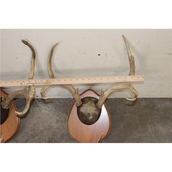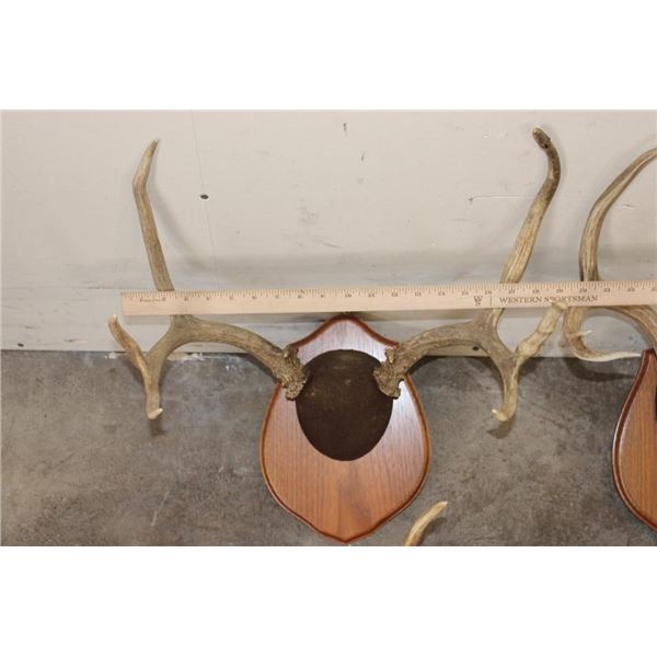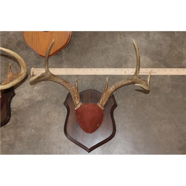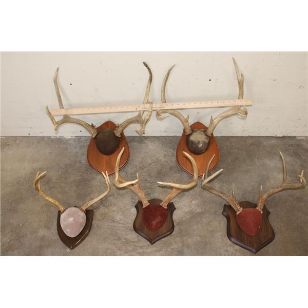 3 MULE DEER Antler Racks and 2 WHITETAIL DEER Antler Racks all on Wooden Plaques. (ONE$) TAXIDERMY