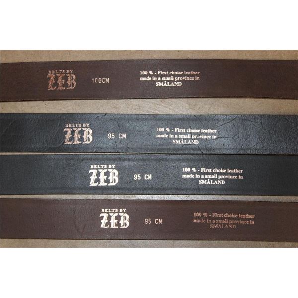 4 Leather BELTS by ZEB. 1 Brown Leather Belt that measures 100 CM (Medium 39.4" Long), 2 Black Leather Belts that measure 95 CM (Small 37.4" Long), and 1 Brown Belt that measures 95 CM (Small 37.4" Long). "100% First choice leather made in a small province in SMALAND". Smaland is a province in southern Sweden. (ONE$) MEN'S ACCESSORIES AND BELTS