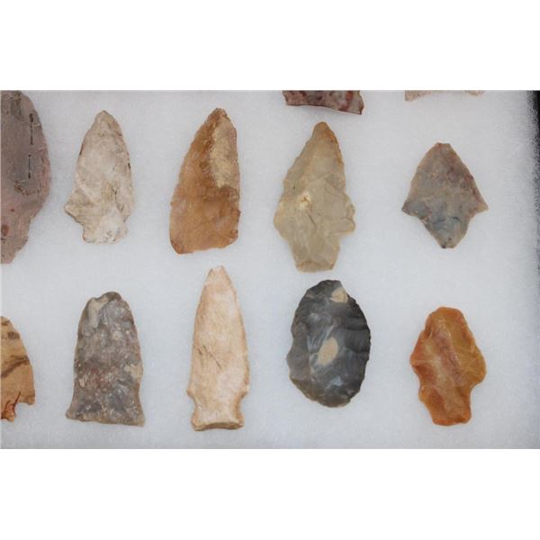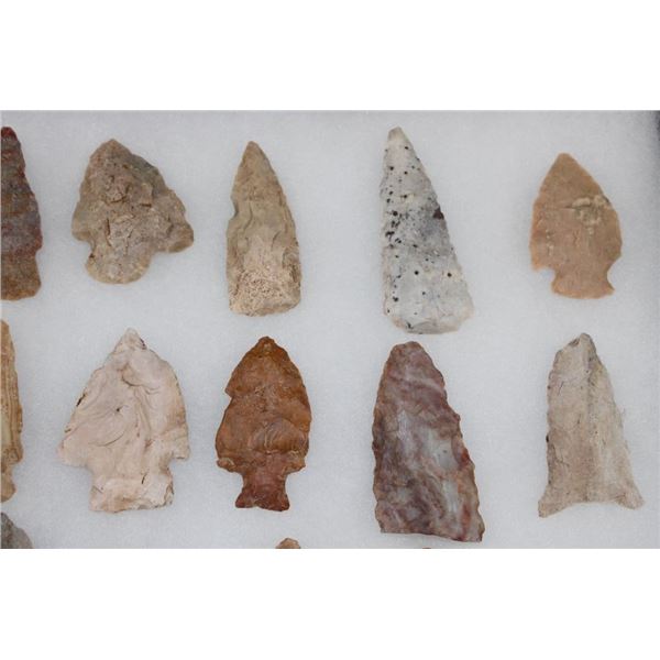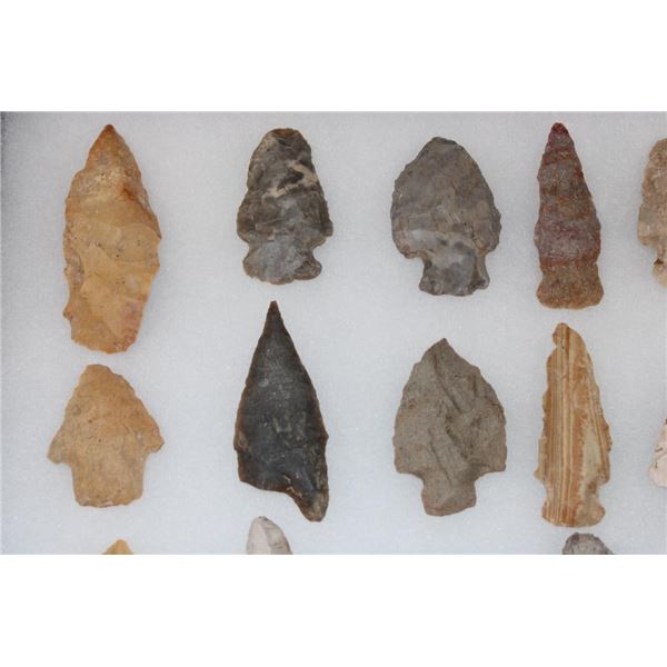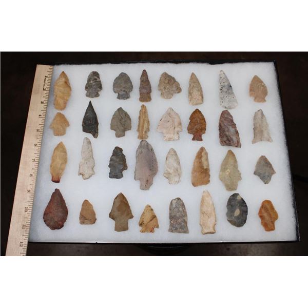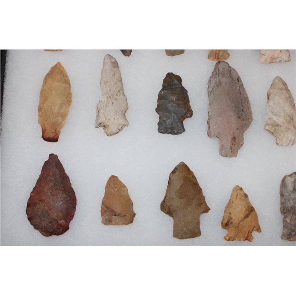 32 Prehistoric Northeast Texas Flint Spear Point ARROWHEADS in a Display Case. The Arrowheads measure 1.5" to 3.25" Long. They date from the Woodland Period (1000 BC - 1000 AD) to the Archaic Period (8000 BC-1000 BC). They are displayed in a 16" Long x 12" Wide Display Case with Glass. (ONE$) ARROWHEADS
